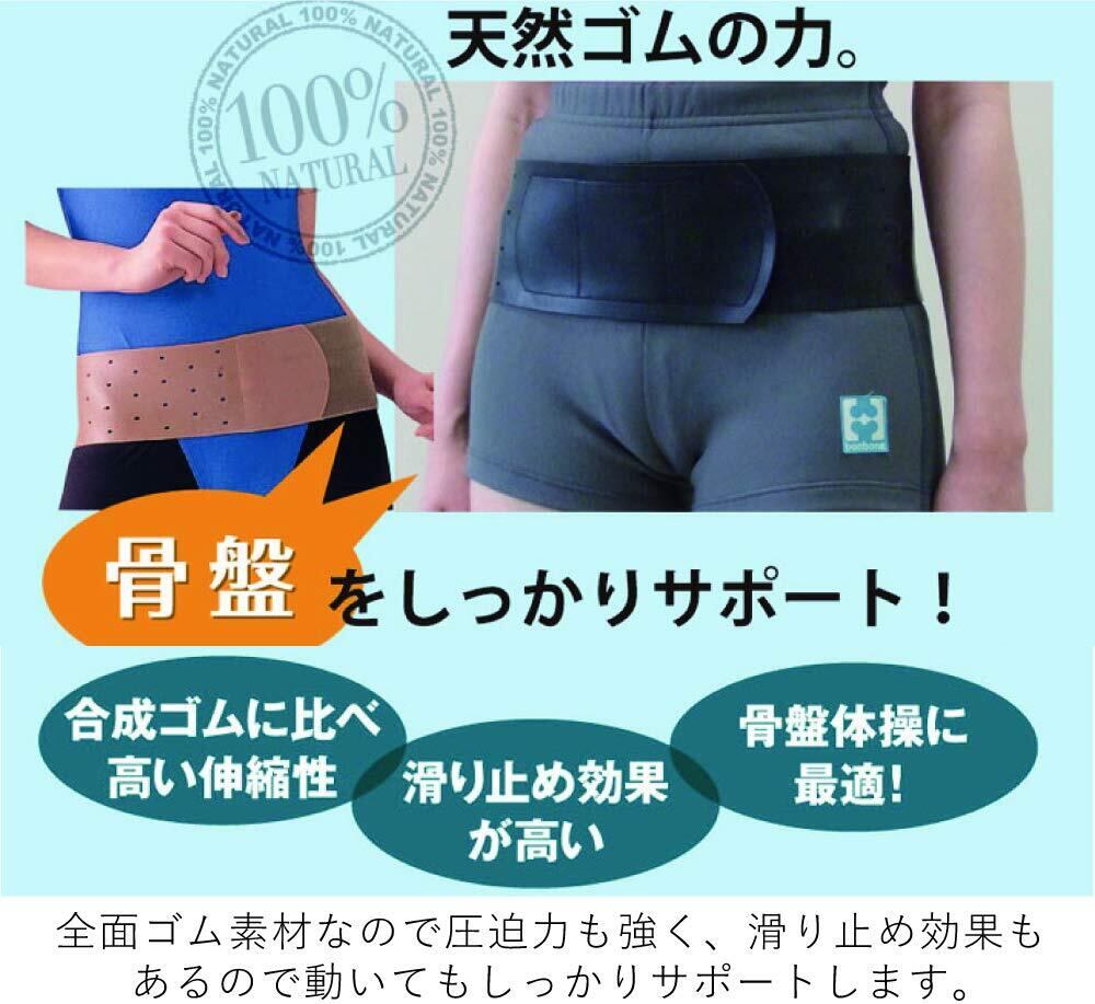 気になる生ゴムの臭いを抑えた天然ゴムの骨盤帯です。天然ゴムなので伸縮力が高くしっかり腰をサポートします。全面ゴム素材は圧迫力が強く滑り止め効果も高いので日常動作でもしっかりと機能を果たし、骨盤体操にも最適です。パンチング加工で通気性にも配慮しています。