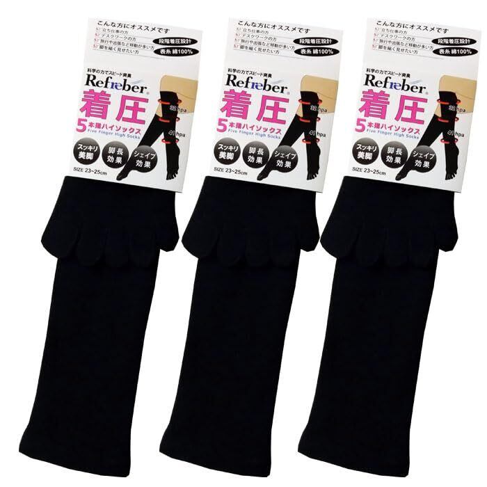 【特価商品】[Refreber] 3足セット 働く女性の着圧5本指ハイソックス レディース 婦人靴下 消臭 黒 ブラック