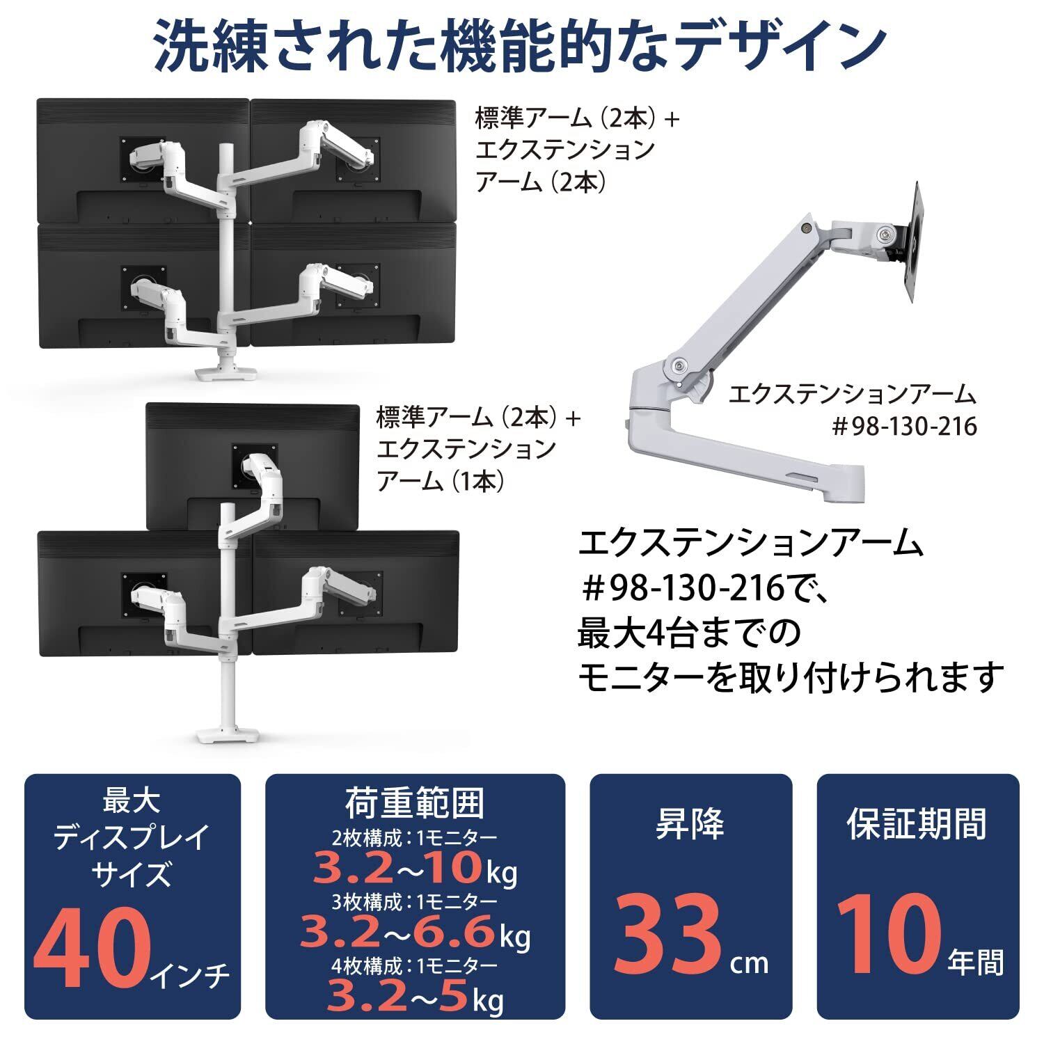 別売の追加用アームキット (97-940-026 アルミ色 / 98-130-216 ホワイト / 98-130-224 マットブラック) で最大4台までのモニターを取り付けできます。