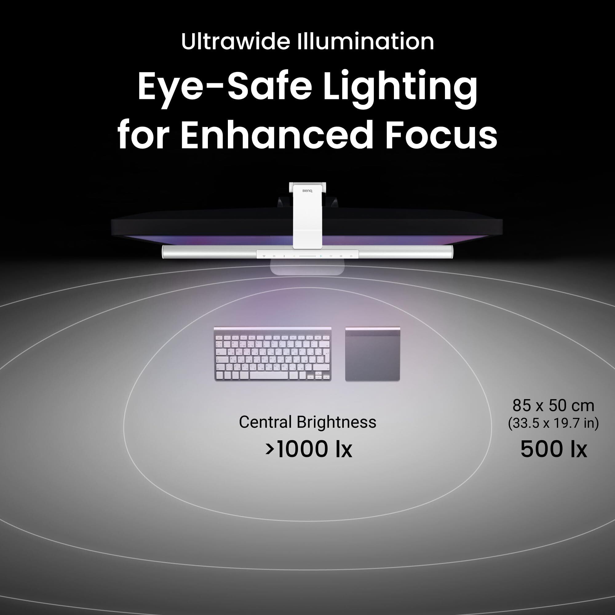 広範囲照明:ScreenBar Pro の中央照度が1000ルクス以上で、85*50cmの範囲で500ルクスの照度を提供し、ほとんどのPC作業環境において目に優しい快適な照明を提供します。