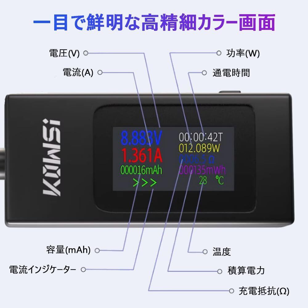 【多機能表示】この電流・電圧チェッカーは、カラースクリーンを搭載しており、電流、電圧、温度、通電時間、容量、インピーダンスなどの情報をリアルタイムで確認できます。USBテスターとして、接続されたデバイスの状況を瞬時に把握することができ、計測の精度が向上します。