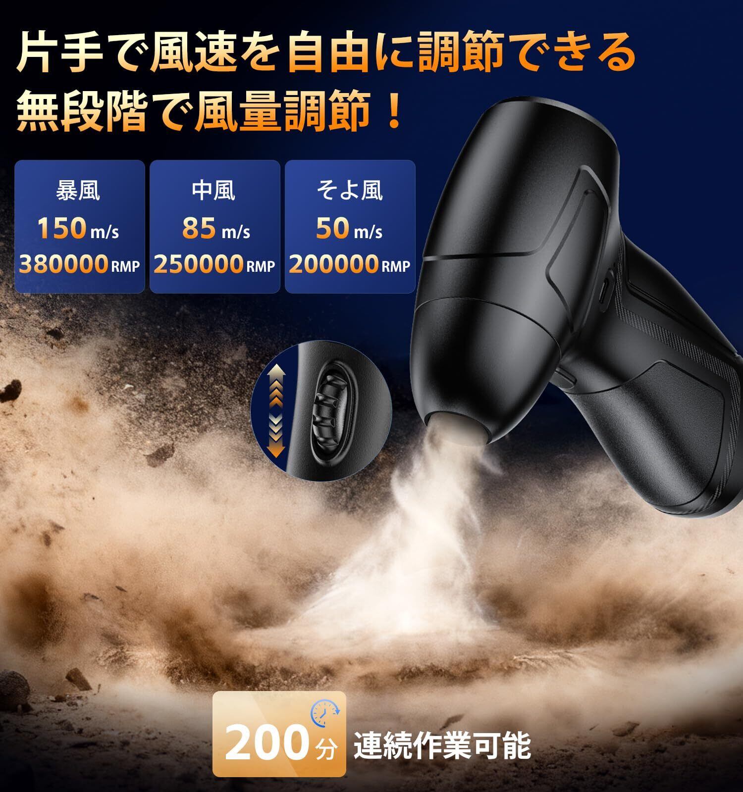 エアダスター 電動ブロワー 洗車【暴風級150m/s・380,000RPM・無段階風量調整・200分連続使用可能】X1小型軽量310g・コードレス 空気入れ USB-C充電(12000mAh)鍵盤/PC/カメラ掃除・水滴/落ち葉飛ばしに最適 ブラシレスモーター・長時間稼働 3種類ノズル付属 黒