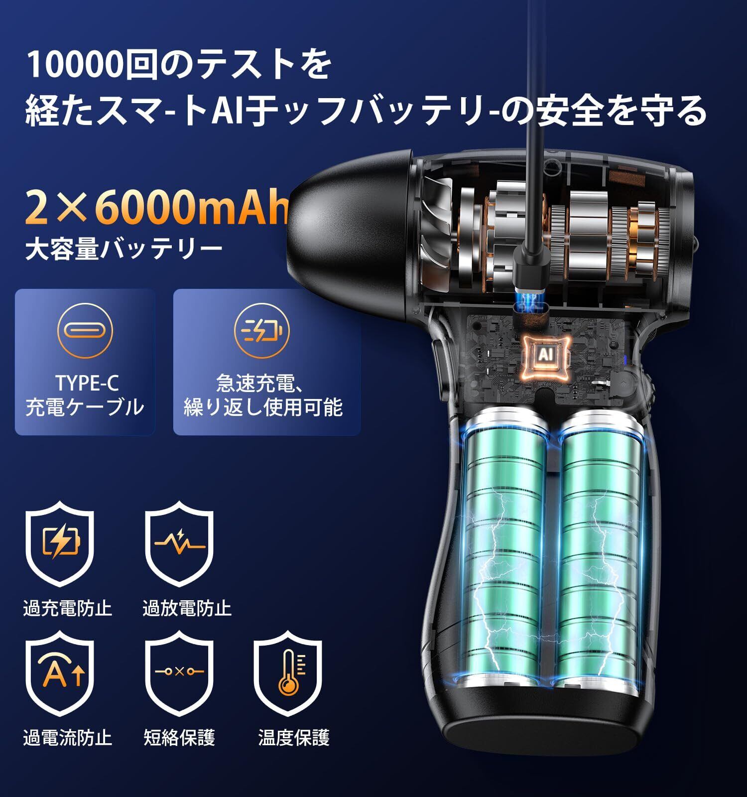 【大容量バッテリー&Type-C急速充電で長時間駆動】AI保護機能搭載の大容量12000mAhバッテリーを内蔵し、1回の充電で最大200分の使用が可能。環境に優しく、使い捨てのエアダスター缶からの卒業ができます。Type-C急速充電に対応しており、車載充電器や家庭のUSBポートでも簡単に充電可能。外出先でも小型軽量設計のため持ち運びやすく、家・オフィス・車内どこでも快適にご使用いただけます。【注意】充電中の使用は危険なため、必ず充電完了後にご使用ください。