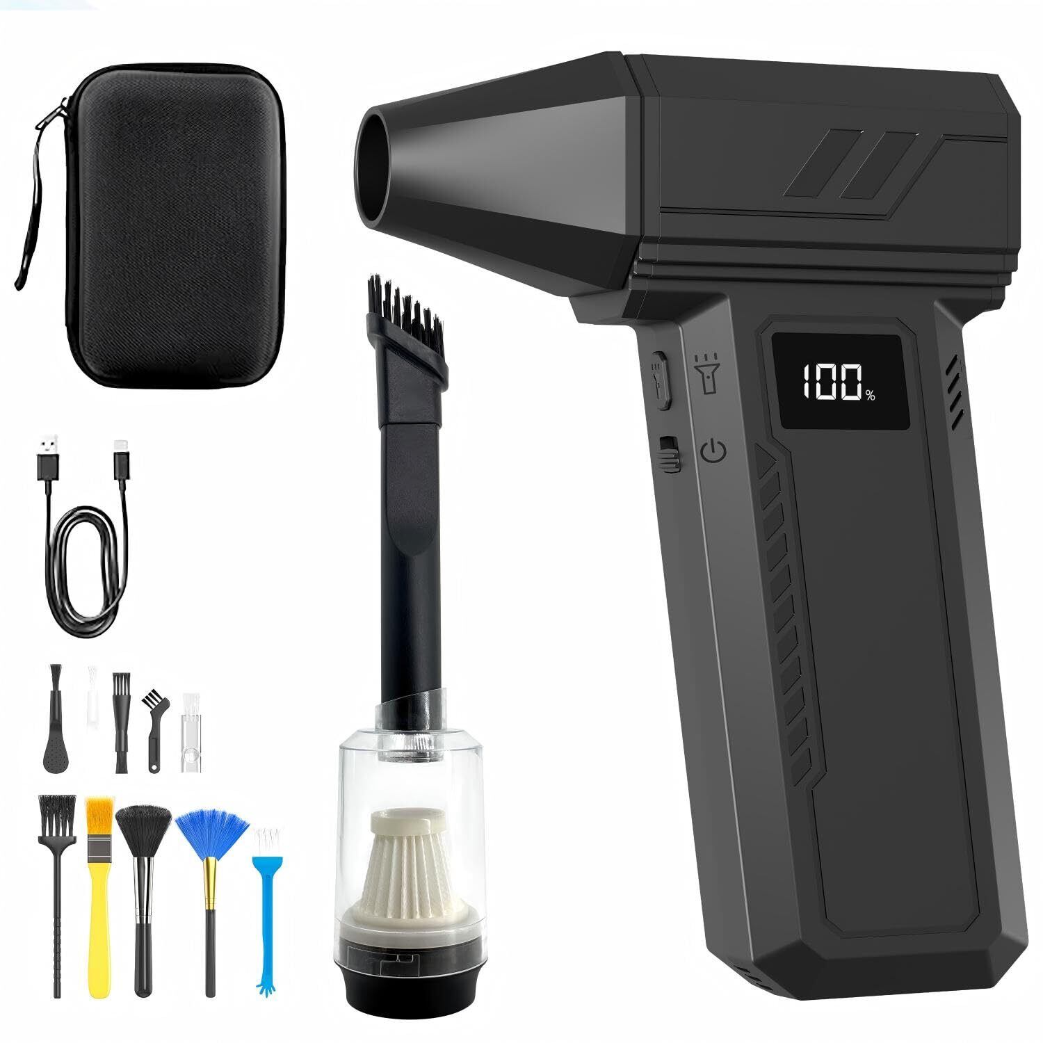 エアダスター 電動エアダスター、暴力ターボファン、13枚のブレード、20000mAh、130000RPM、ミニジェットヘアドライヤー、強力なファン、100段階調整可能な速度、屋外照明、ディスプレイ付き、Type-C充電、軽量プラスチックで変形しにくい、瞬間推力1.5kg/s、風速900W 41m/s (黑)