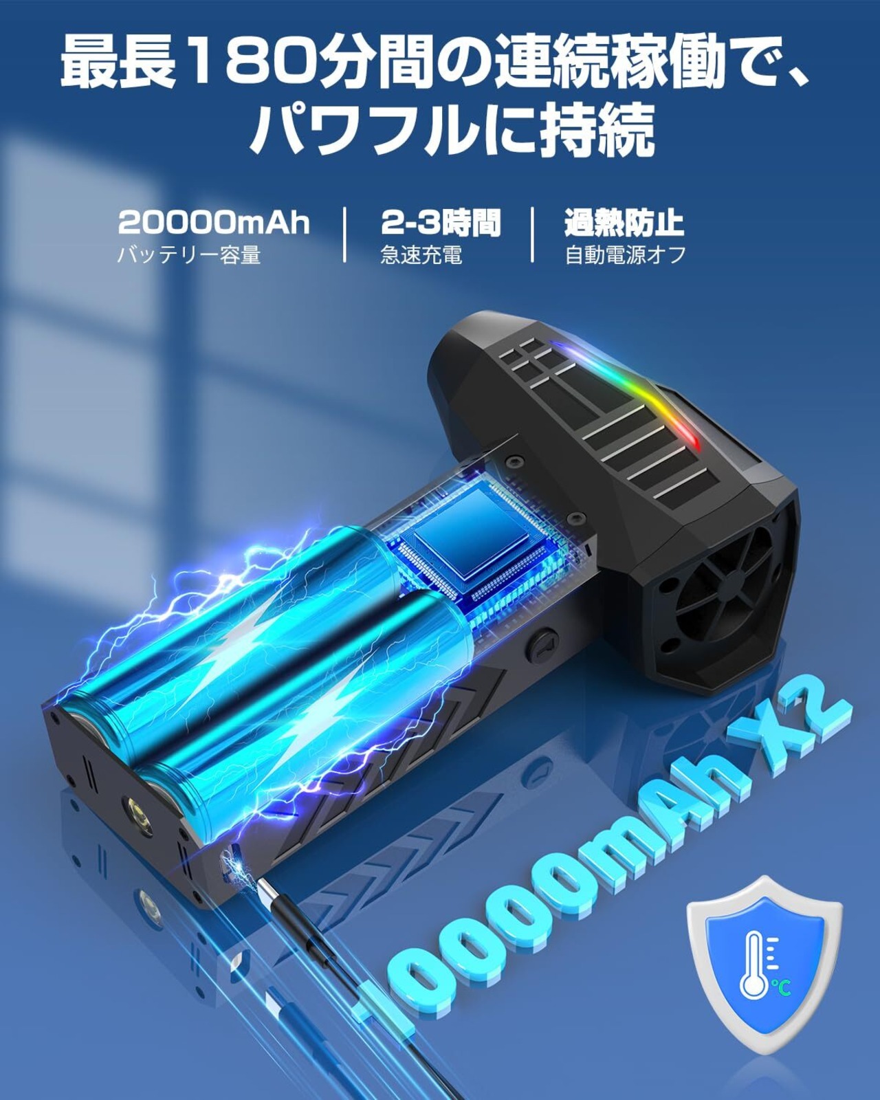 【20000mAh大容量バッテリー|ディスプレイ表示】従来型(5000mAh)の4倍以上の大容量で、フル充電時は最大180分連続使用が可能。長時間、途切れることなくパワフルに動作し、充電の心配も一切不要!使い捨てエアダスターと比べて経済的かつ環境にやさしく、ニオイや空缶処理の心配も不要。さらにAI保護機能(過電流・過熱・過充電・過電圧)を4重搭載し、安全性も抜群。 液晶画面には風速モードとバッテリー残量をリアルタイム表示。操作が一目でわかりやすく、室内・車内・アウトドア・オフィスなど幅広く活躍します。