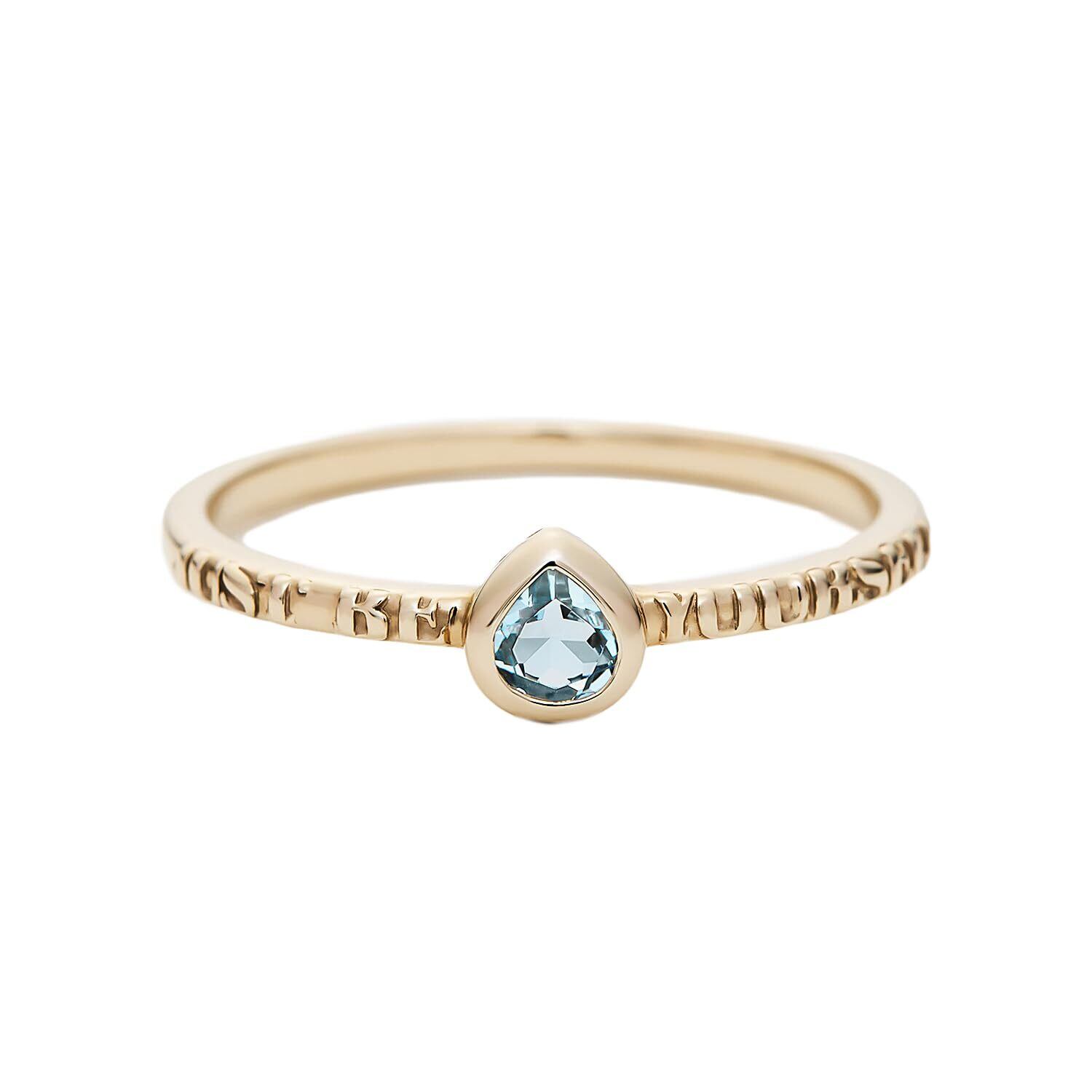 【Luck Collection】 奇跡をもたらすと言われるメダイをモチーフに、繊細で小さな世界にこだわりを詰め込んだコレクション。 オリジナルの縦横比にこだわったドロップカットのアクアマリンを覆輪留めでスッキリと仕上げたリング。 リングアームに隠されているのは、「JUST BE YOURSELF (ありのままのあなたで)」のおまじない。 中心の天然石を挟むように浮き彫りで刻んだメッセージは、文字の上下をあえて隠し、自分だけが読むことのできる秘密のおまじないのように。 細部にこだわりを詰め込み、大切に身に着けられてきたアンティークジュエリーのような温かみを表現しています。 モチーフや天然石を組み合わせて、自分だけのお守りに。※サイズ直し不可。※天然石や天然素材を使用しているものは、サイズ・色味・風合いの違いや、若干の傷、内包物の有無などに個体差があります。予めご了承ください。