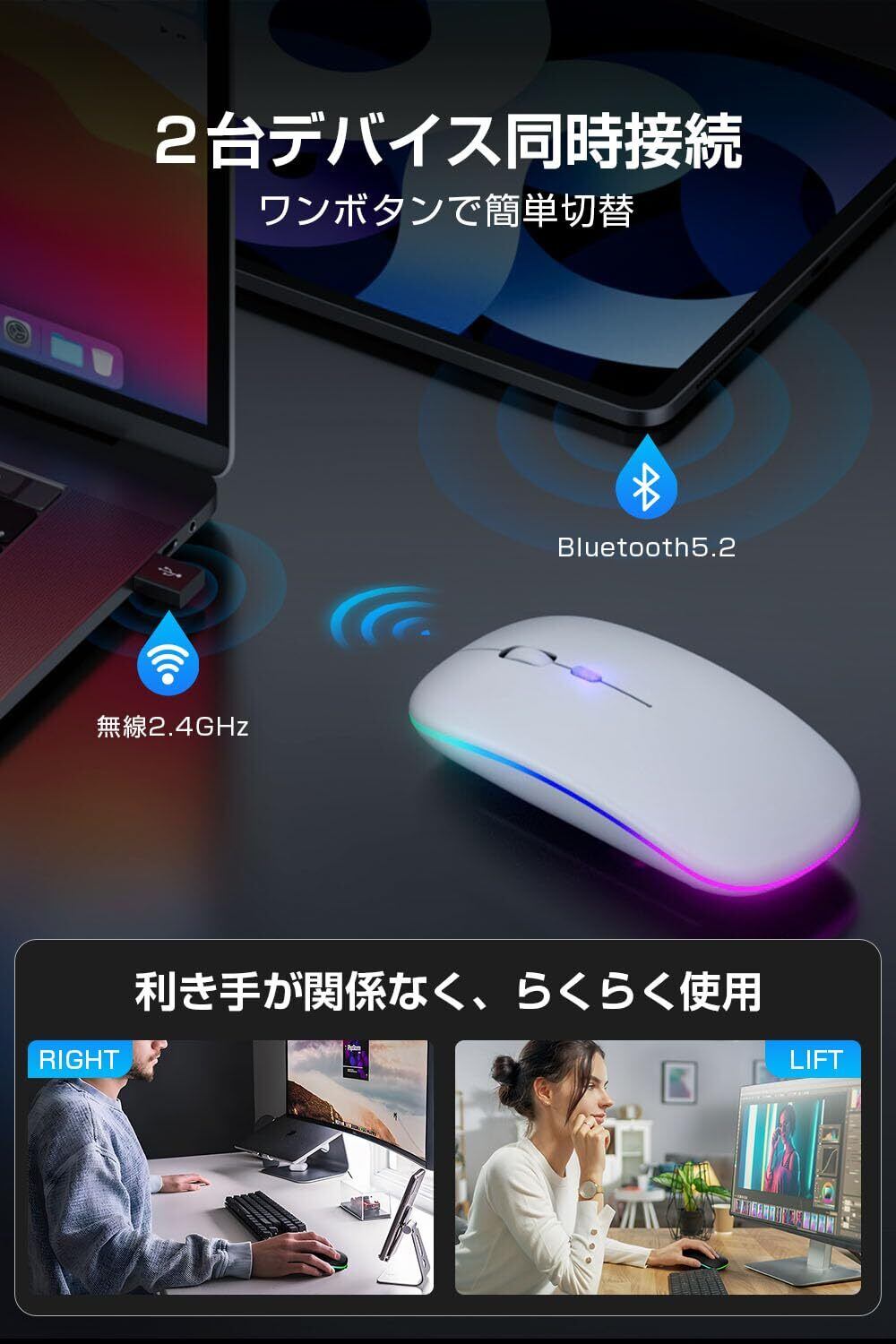 マウス 無線 Bluetooth 5.2 【Type-C充電式 & 静音】 ワイヤレスマウス 薄型 小型 パソコン 瞬時接続 省エネ 高感度 ブルートゥース ゲーミングマウス 2.4GHz 3段階DPI切替 2台デバイス同時接続 7色ライト 500mAhバッテリー 光学式 高耐久性 mac/ノートパソコン/タブレット/ipad 対応(White)