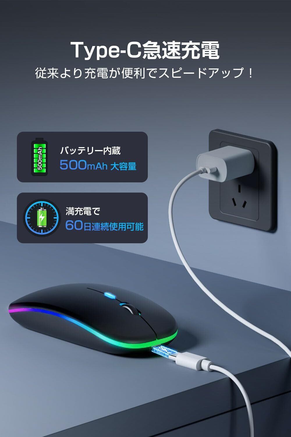【Type-C充電式&長時間の使用可能】 この無線マウスはType-C充電ポートを採用しており、急速充電が可能です。500mAhの大容量バッテリーにより、一度の充電で2ヶ月間使用することができます。バッテリー残量が少なくなった場合でも、すぐに充電ができます。充電時間が短いため、充電切れの心配が少なくなります。万が一、バッテリーが切れても充電しながら使用できますので、スムーズな作業やゲームプレイを中断することなく楽しむことができます。(無操作時には自動的にスリープモードに入り、省エネ効果があり、再クリックで復帰します)