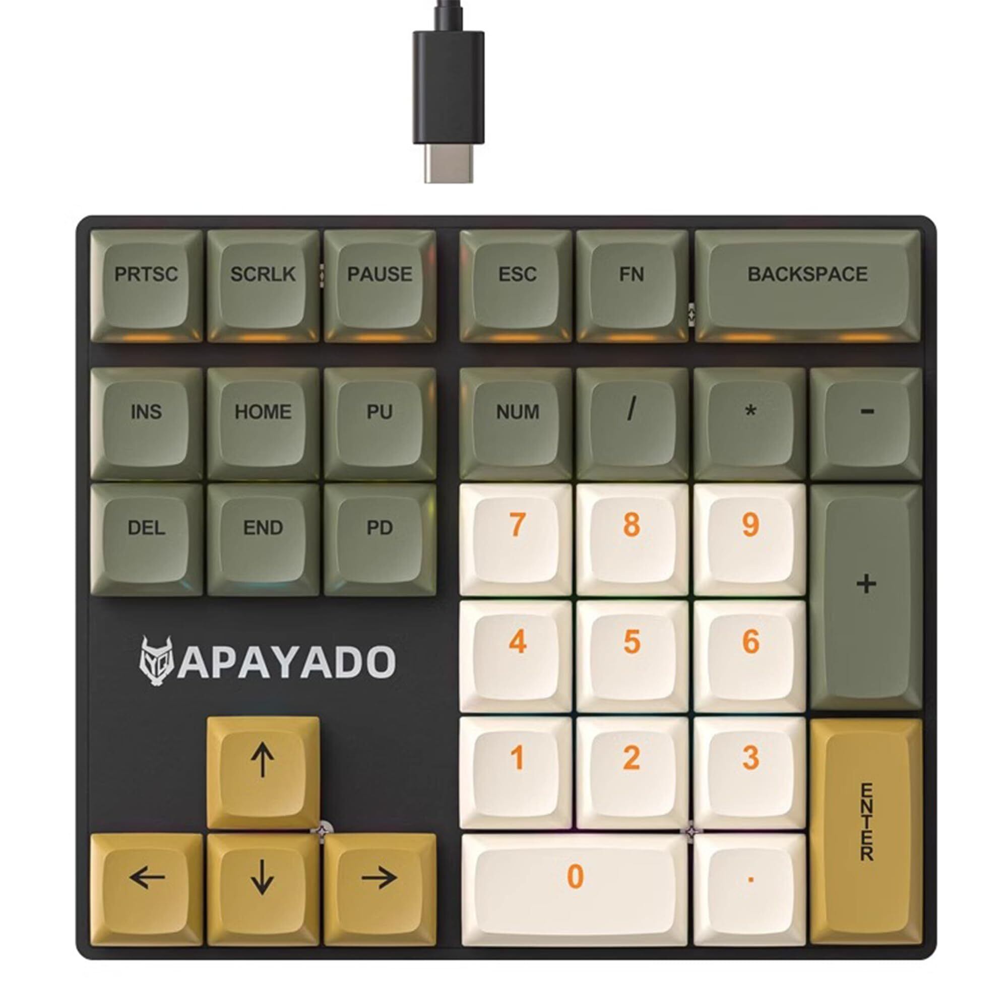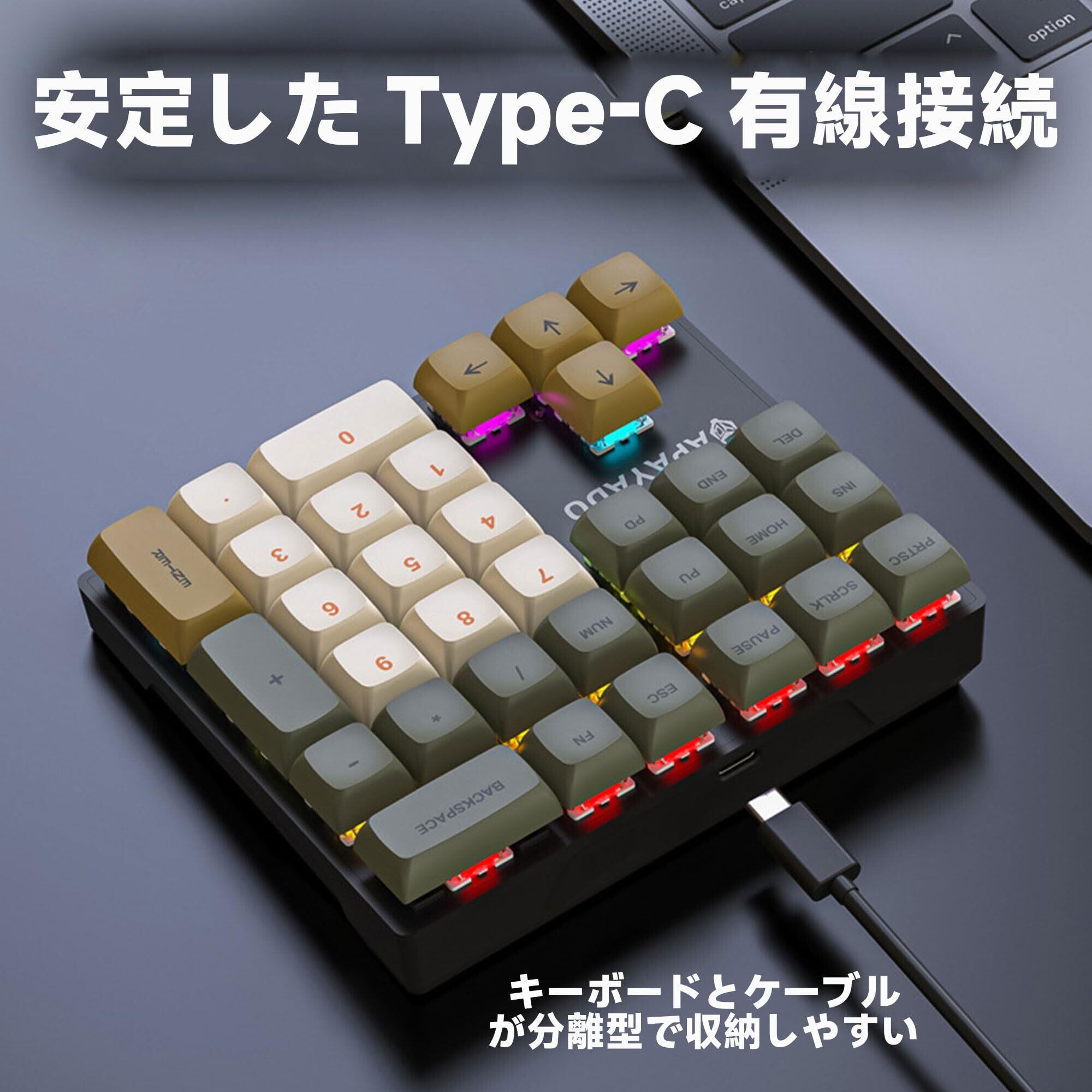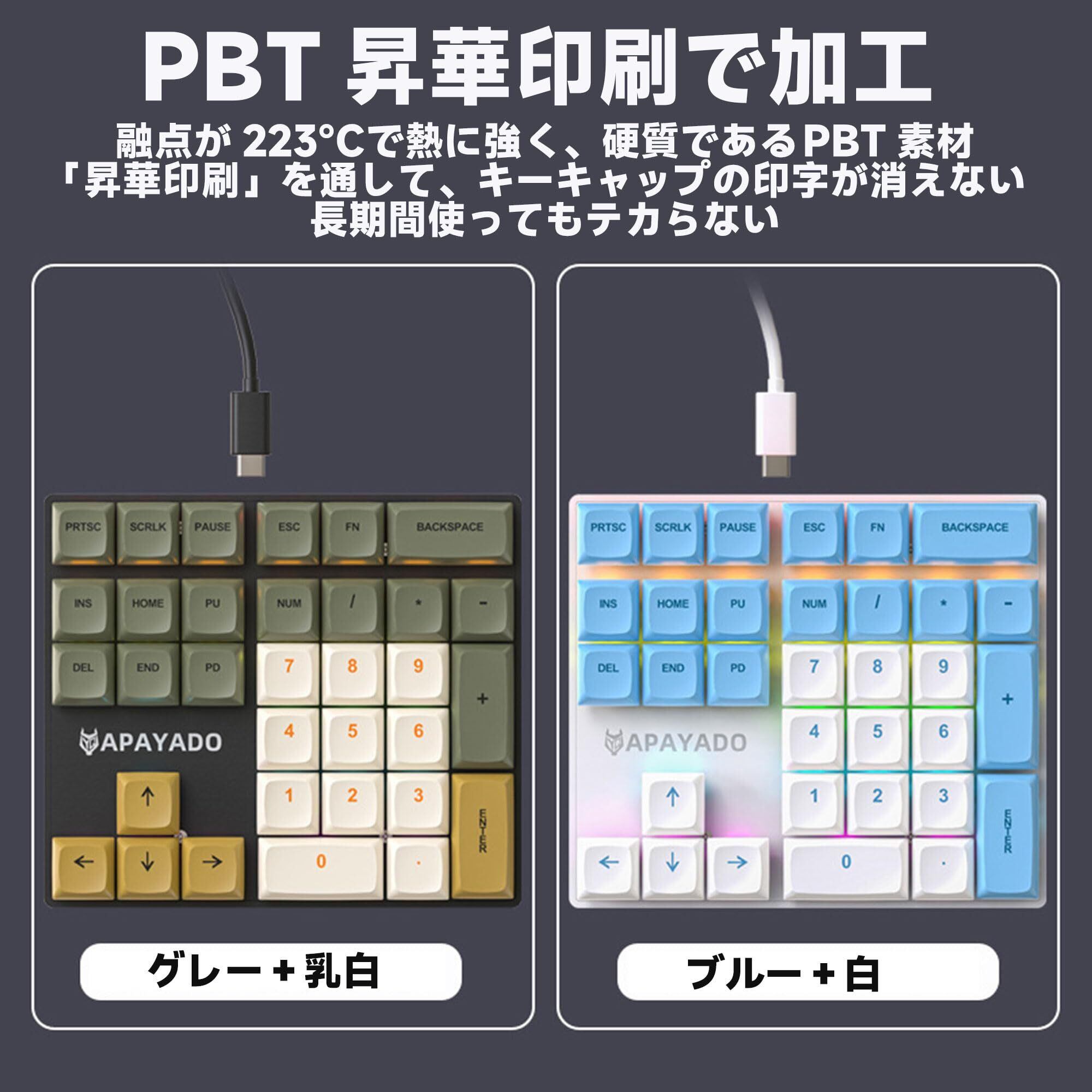 【PBT昇華印刷で加工&安定したType-c有線接続】メカニカルテンキーが採用したPBTは熱に強く硬質で、融点が223℃と高いため、「昇華印刷」が利用できます。「昇華印刷」の加工を通して、キーキャップの印字が消えないことを実現したうえに、長期間使ってもテカりません。また、キーキャップのDIYを楽しむこともできます。(軸を交換できません)テンキーボードはType-c有線接続を採用し、安定していて、Bluetooth が不安定な場合での入力損失やデータの入力間違いを避けます。キーボードとケーブルが分離型で収納しやすいです。