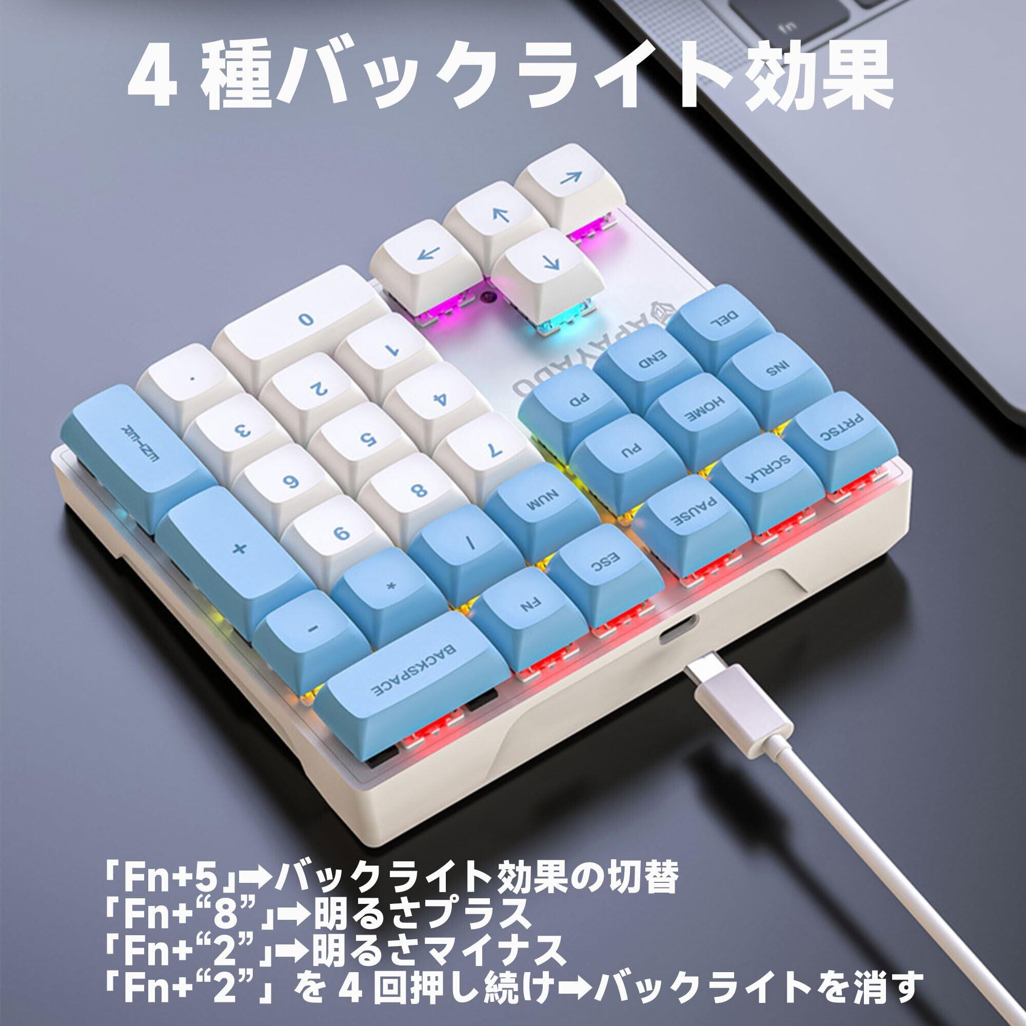 【4種バックライト効果 メカニカルテンキーボード】バックライト効果を備えた数字テンキーボードで、Fn+数字キーの組み合わせによるライトのオン/オフ、および明るさを調整します。「Fn+5」で4種のバックライト効果の切替を実現し、「Fn+“8”」は明るさプラス、「Fn+“2”」は明るさマイナスです。「Fn+“2”」を4回押し続けると、バックライトを消すことになります。