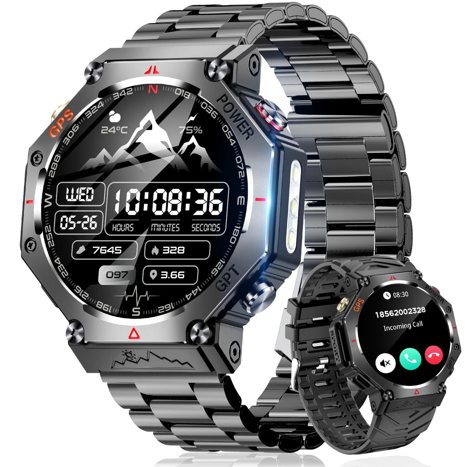 スマートウォッチ【2025年業界新登場 ChatGPT搭載】高輝度懐中電灯 軍用規格 Bluetooth5.3通話 スポーツウォッチ 3ATM防水 耐衝撃 GPS運動軌跡記録 腕時計 長持ちバッテリー 100+運動モード DIY文字盤 高度計 気圧計 コンパス Lineなどアプリ通知 歩数計 iPhone アンドロイド対応 日本語説明書
