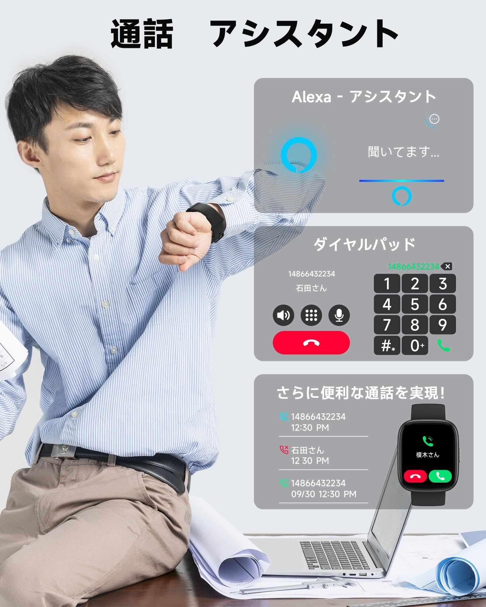 ■【通話機能とAI音声アシスタントで便利な生活を!】Bluetooth 5.3により、スマートウォッチから直接通話が可能です。運転中や手がふさがっている時でも、手軽に通話ができ、またAlexa音声アシスタント機能を利用して、天気情報やリマインダーの設定なども簡単に行えます。