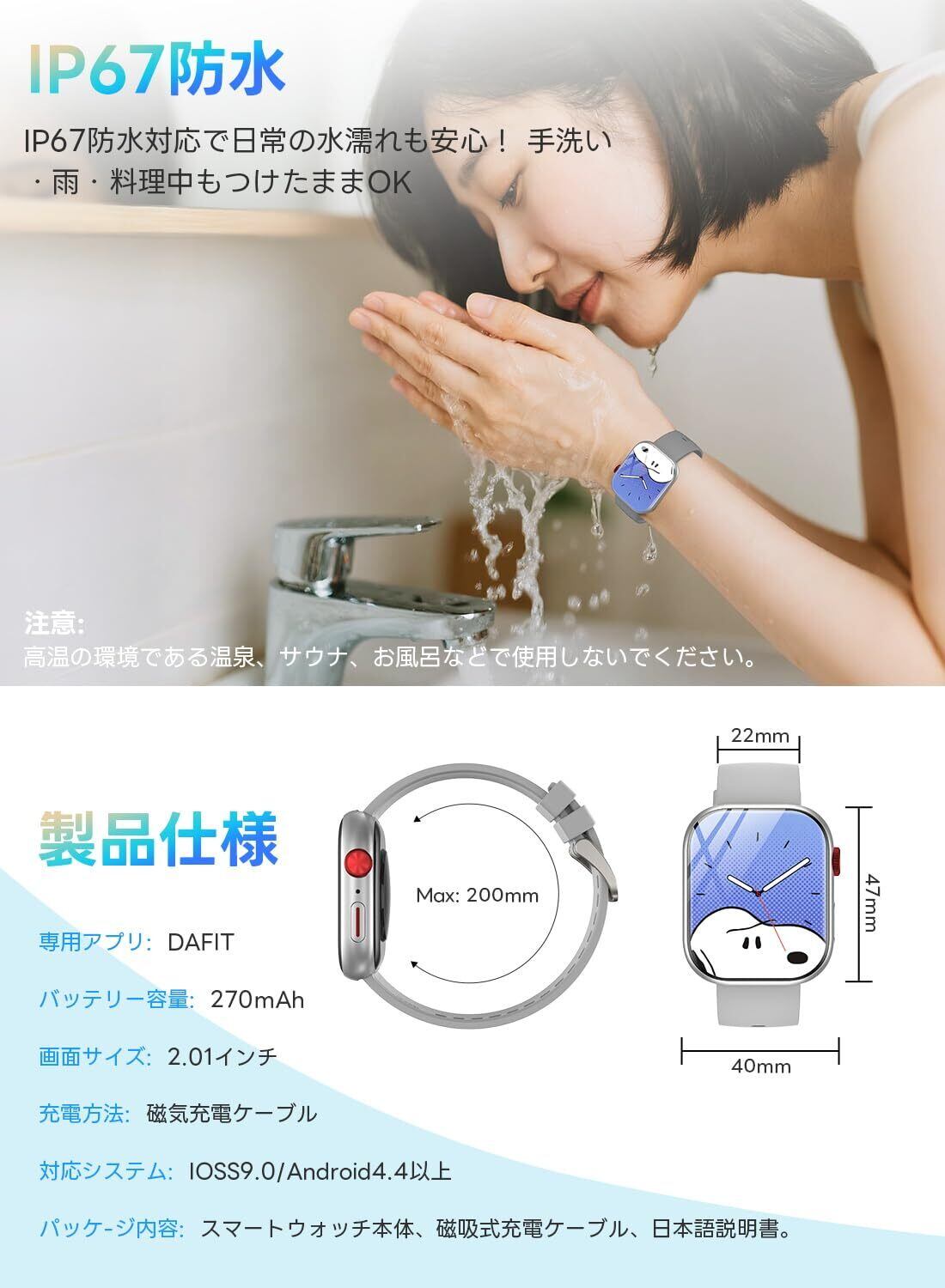 ■【IP67等級の防水性能で安心!】このスマートウォッチはIP67の防水機能を備えており、日常生活における水濡れからしっかりと保護します。雨の日や運動中でも安心して使用していただけます。