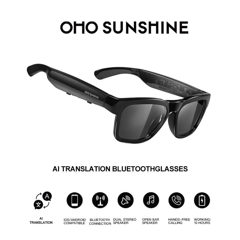 OhOサンシャインAI翻訳スマートグラス、bluetoothスピーカー付き、明るい黒の鏡枠とフォトクロミックレンズ付きで、屋外と屋内に適しています
