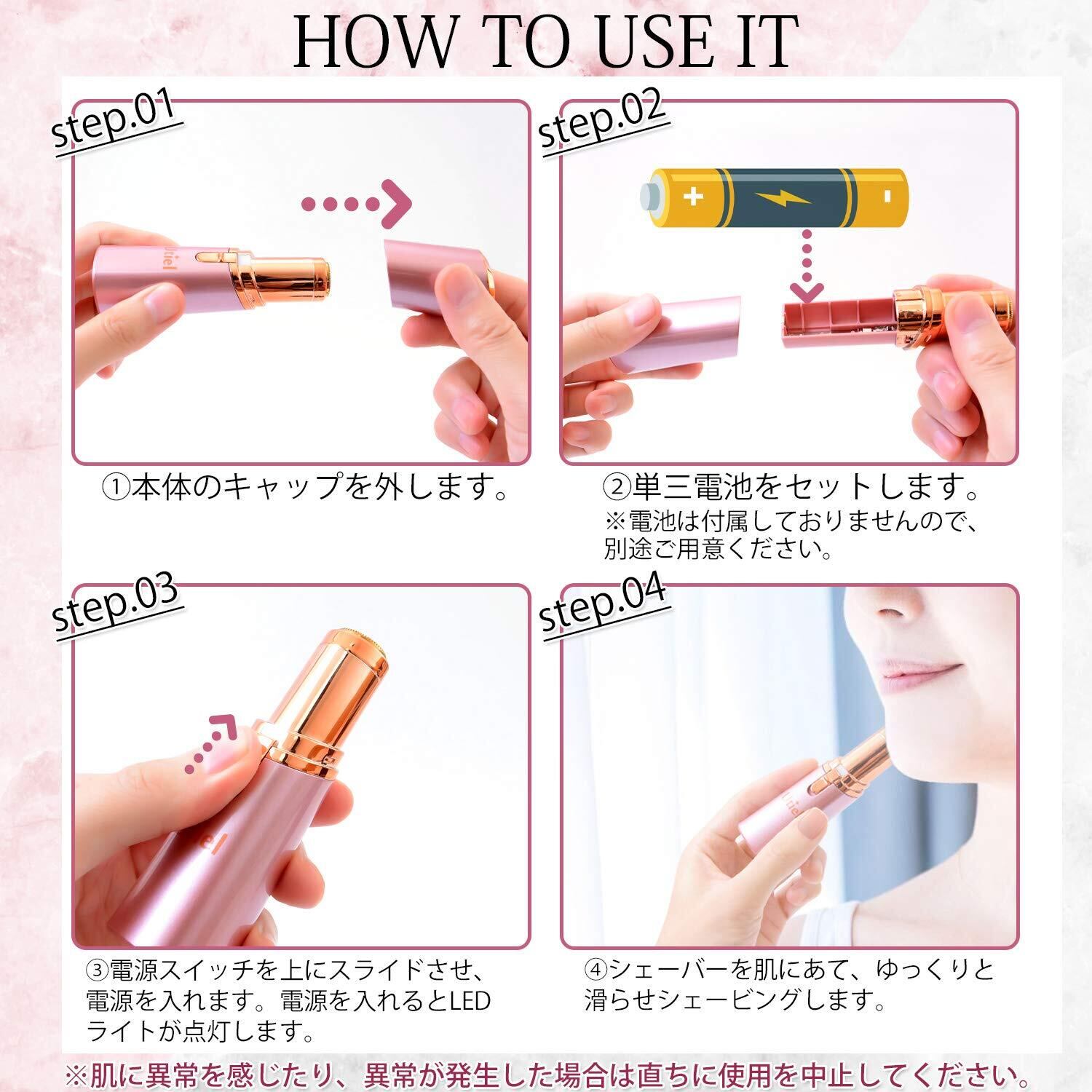 【お肌に優しい剃り味】 お肌に直接触れない回転式内刃を採用。単三電池1本で動作します(注:電池は別途ご用意ください)。簡単に産毛・お顔のムダ毛をきれいに除去できます。刃が直にお肌に触れることもないので、処理中の痛みはなく、優しい肌当たりで処理いただけます。自宅でのご使用はもちろんのこと、外出時にバッグから取り出して手軽にお肌のケアをすることも可能です。