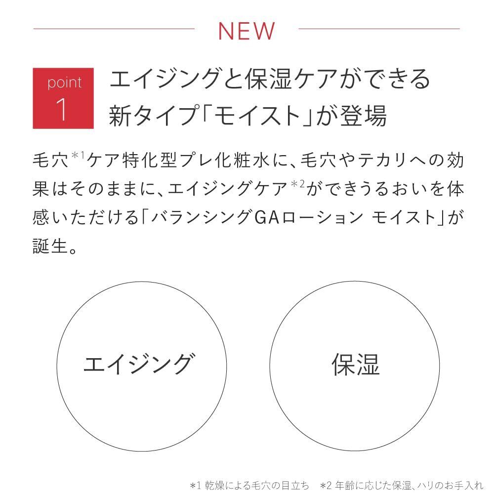 【バランシングGAローション モイスト】毛穴に働きかけるグリシルグリシンを6%と、テカリケアするアゼライン酸誘導体を2%配合。さらに、エイジング肌ケア成分であるナイアシンアミドやフラーレン、5種のセラミドなどの保湿成分を贅沢に配合したプレ化粧水です。大人の肌荒れにアプローチしてザラつきをケアし、なめらかでみずみずしい肌へ導きます。毛穴やテカリへの効果だけでなく、保湿感やエイジングケアへの働きも求める方におすすめです。