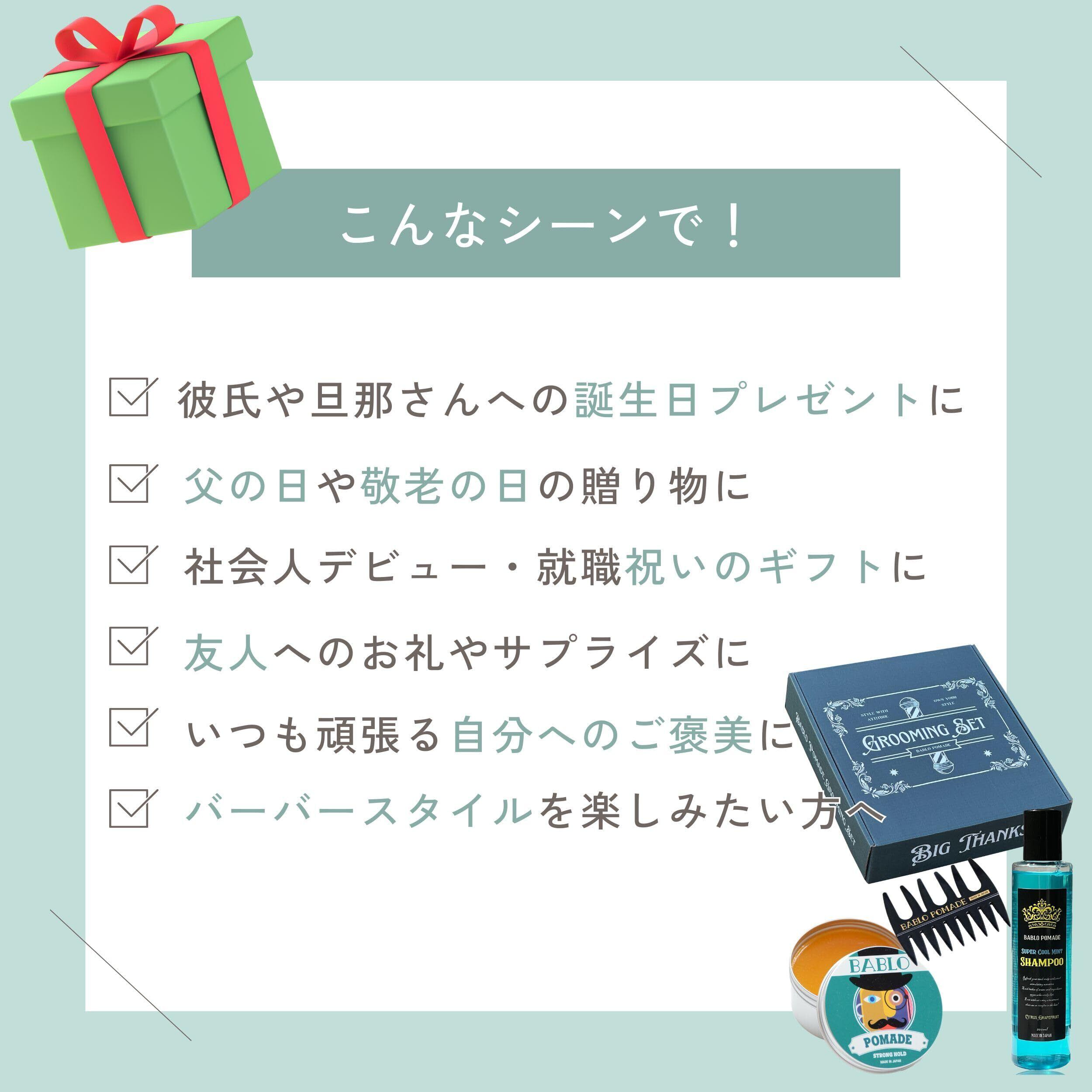 BABLO POMADEのプレゼントBOX。 大人の男性に人気のポマード&ミントシャンプー&メッシュコームがセットになったギフト用贈り物セット。パートナー、彼氏、友人、父親への日頃の感謝や、誕生日プレゼントに。敬老の日のプレゼントとして、ダンディーな祖父への贈り物としても人気。