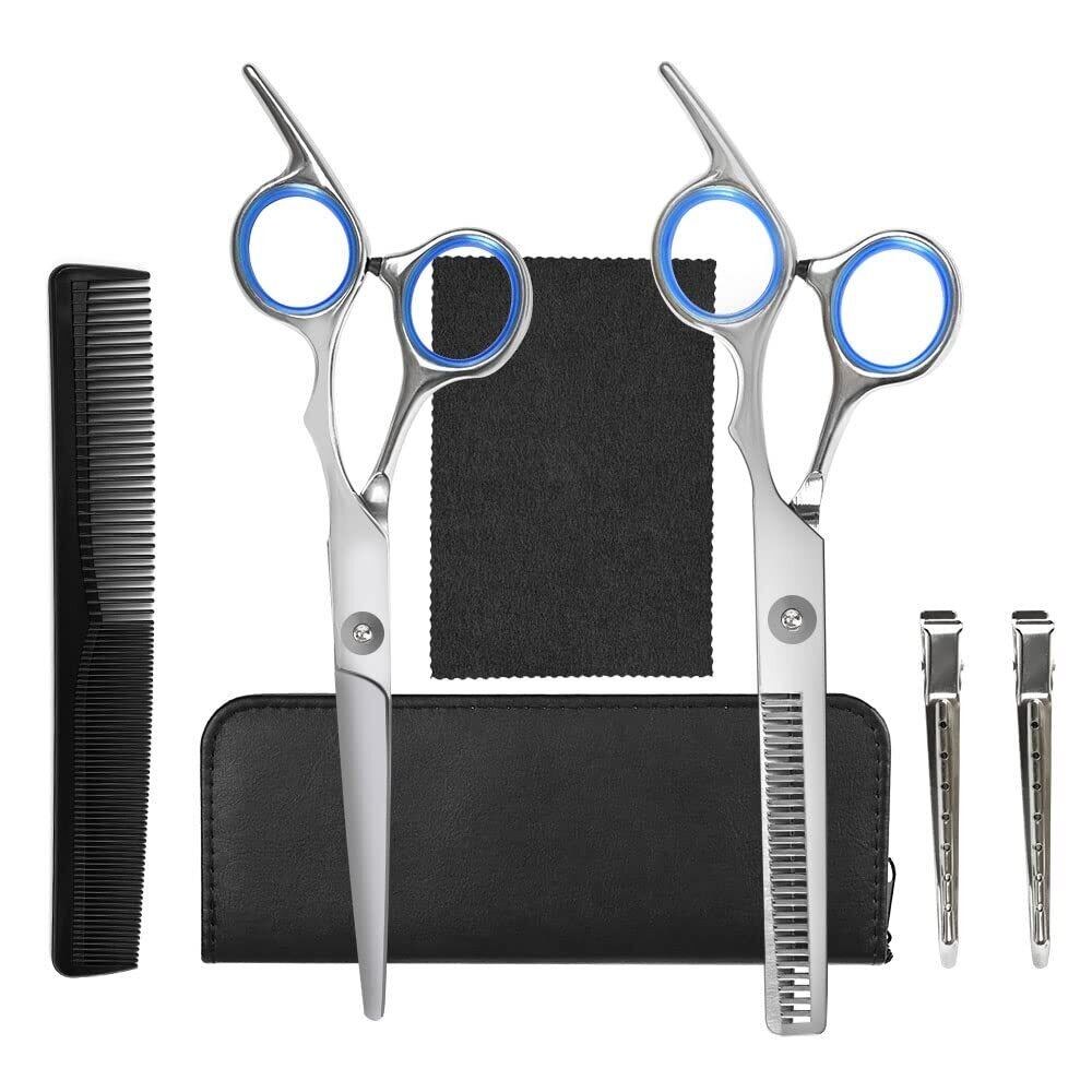 【散髪 ヘアカット| 7点セット】ヘアスタイルを整えて、このセットで解決します。ヘアサロンに行く時間とお金を節約できます。大人も子供も安心して使えます。商品の内容:カットシザー、 セニングシザー、革製ケース、コーム(くし)、ヘアピンx2、クリーニングクロス。