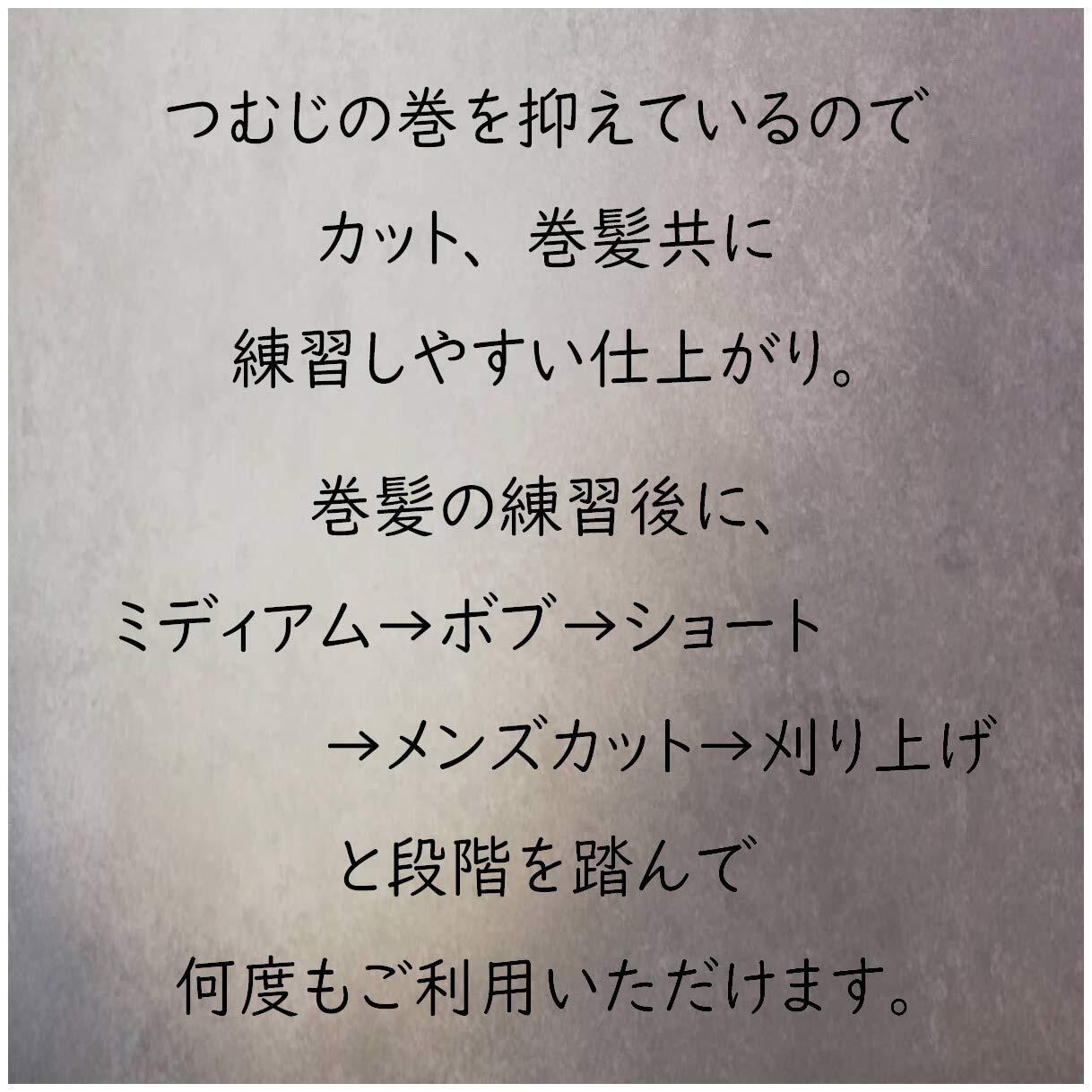 人毛100%・つむじ・立体耳あり。練習用に最適なカットウィッグです 毛量:約100g・前髪:約30cm ・トップ:約35cm ・襟足:約25cm ・もみあげ:約25cm ・ハチ廻り:51cm あらゆるデザインカットにご使用になれる高品質な練習用カットウィッグです。 前髪、トップ、襟足、もみあげ、ハチ廻りの毛量、長さを自然なバランスに仕上げており、トレーニングに最適なカットウィッグです。 100%人毛が使用されており、人体構造を考慮し、つむじや立体耳付きになっています。