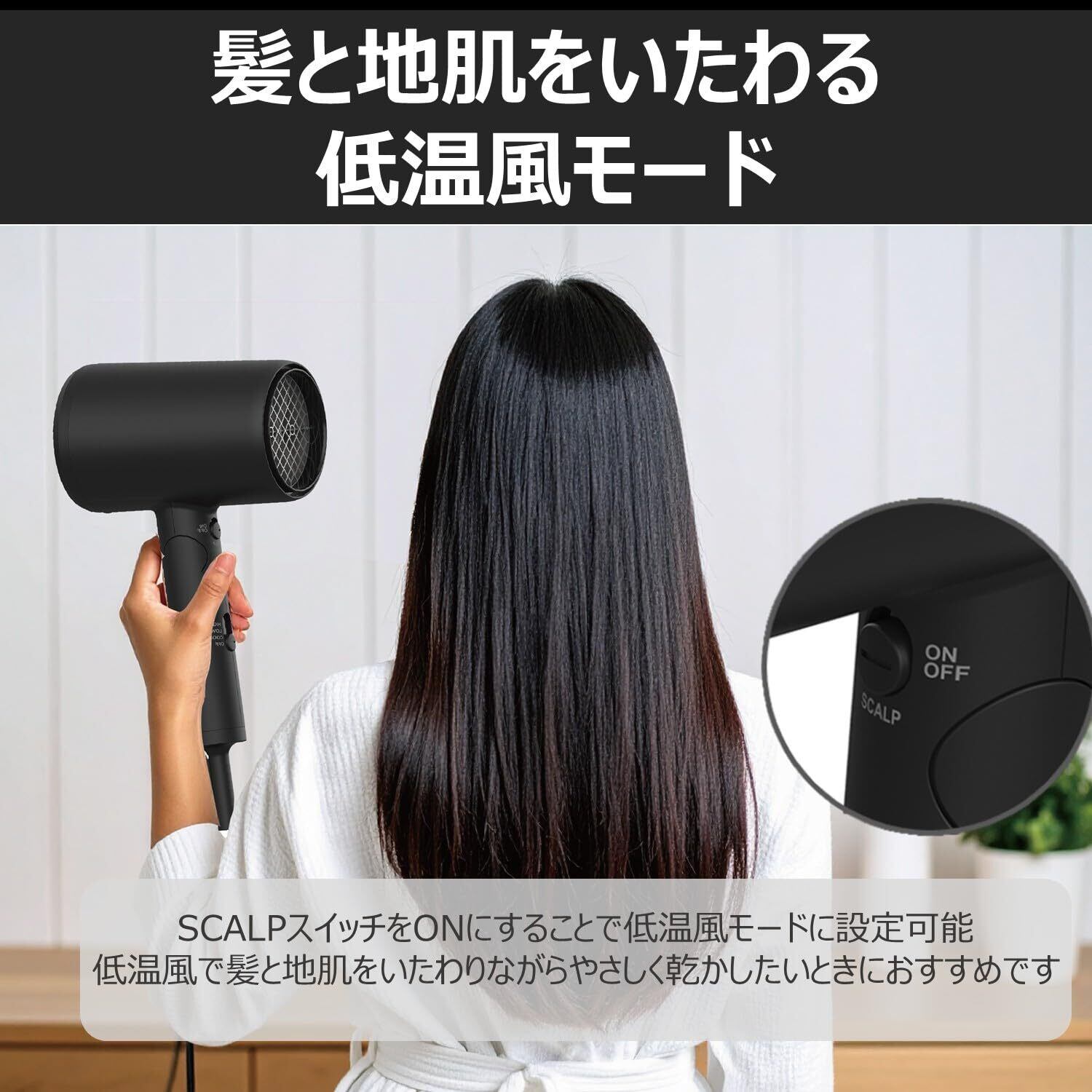 ■【低温風モードで髪に優しい!】特別な低温風モードを搭載しており、髪を優しく乾かすことができます。高温によるダメージを気にすることなく、理想的なスタイリングが実現します。ダメージレスなヘアケアを実現するための強力なパートナーです。