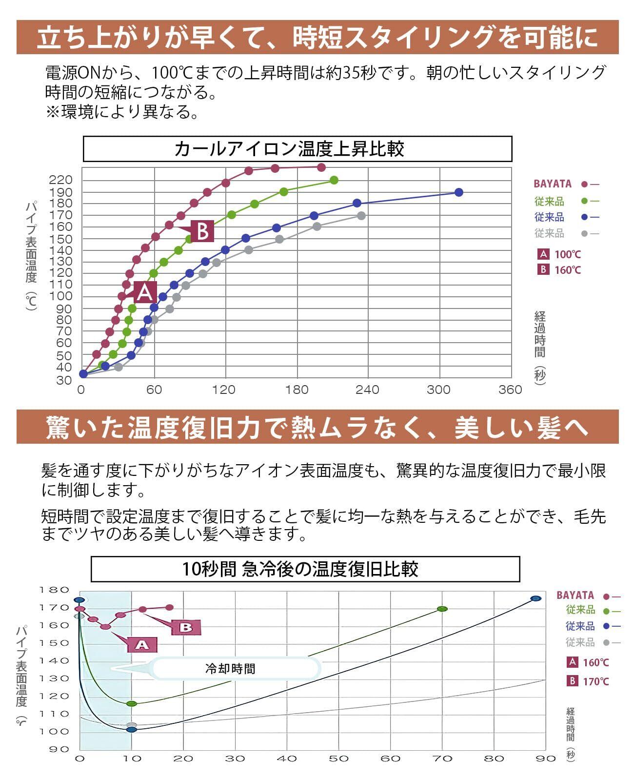 【急速な立ち上がり時間】このコテは電源を入れてから約35秒で使用可能な温度(100℃)に達します。全部髪質に対応する160℃まで75秒くらいがかかります。抜群な立ち上がり時間のかけで、忙しい朝も、キレイなカールを作られます。