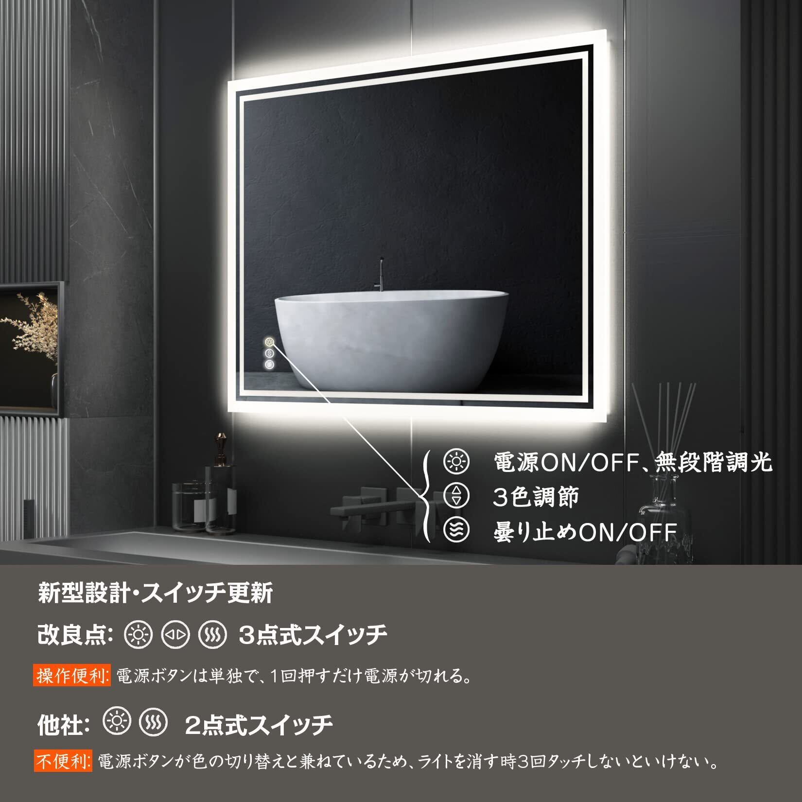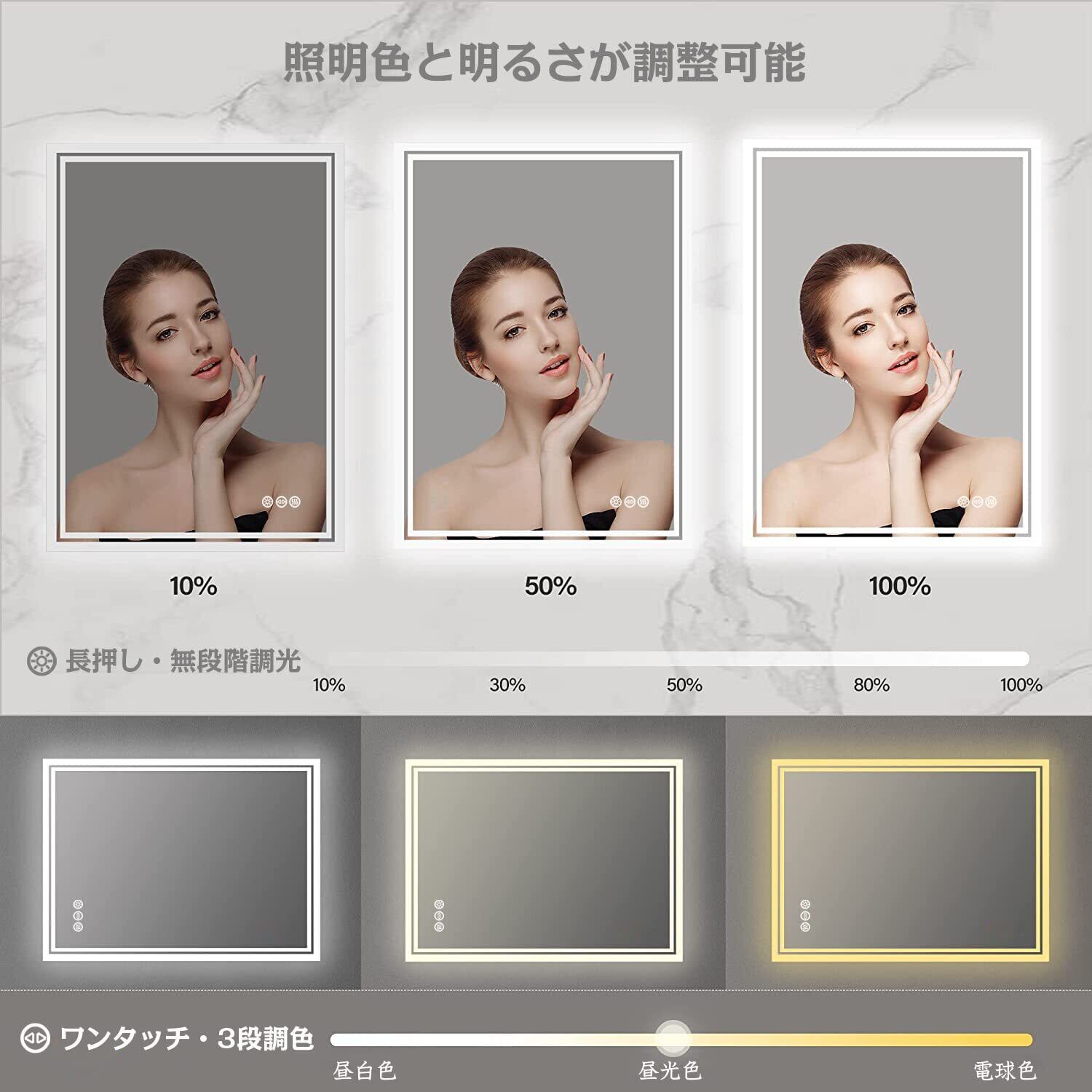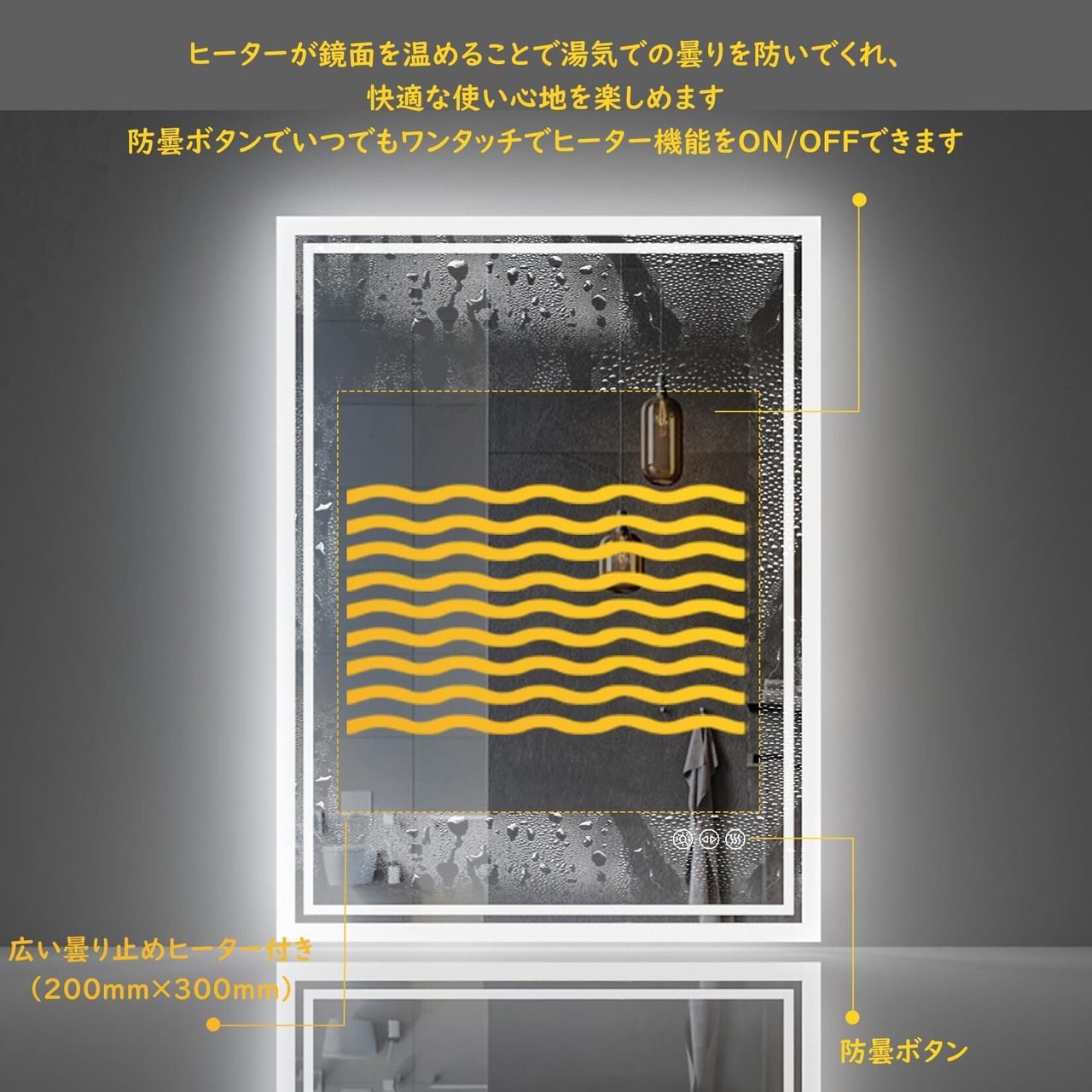 【耐久性に優れる・品質】鏡が厚み5mmのガラスを採用、フレームが頑丈なアルミ合金素材を採用し、しっかりした作りで長くお使い頂けます。本製品のLEDは国際防水基準IP65に適合し、お風呂場など湿気の多い場所でも使用することも可能です。【3年安心】お客様に安心してご購入頂 けるよう、本製品をご購入後、一年間の品質があります。何の品質問題があれば、どうぞこちらにご連絡ください。ぜひ24時間以内に返信いたします。