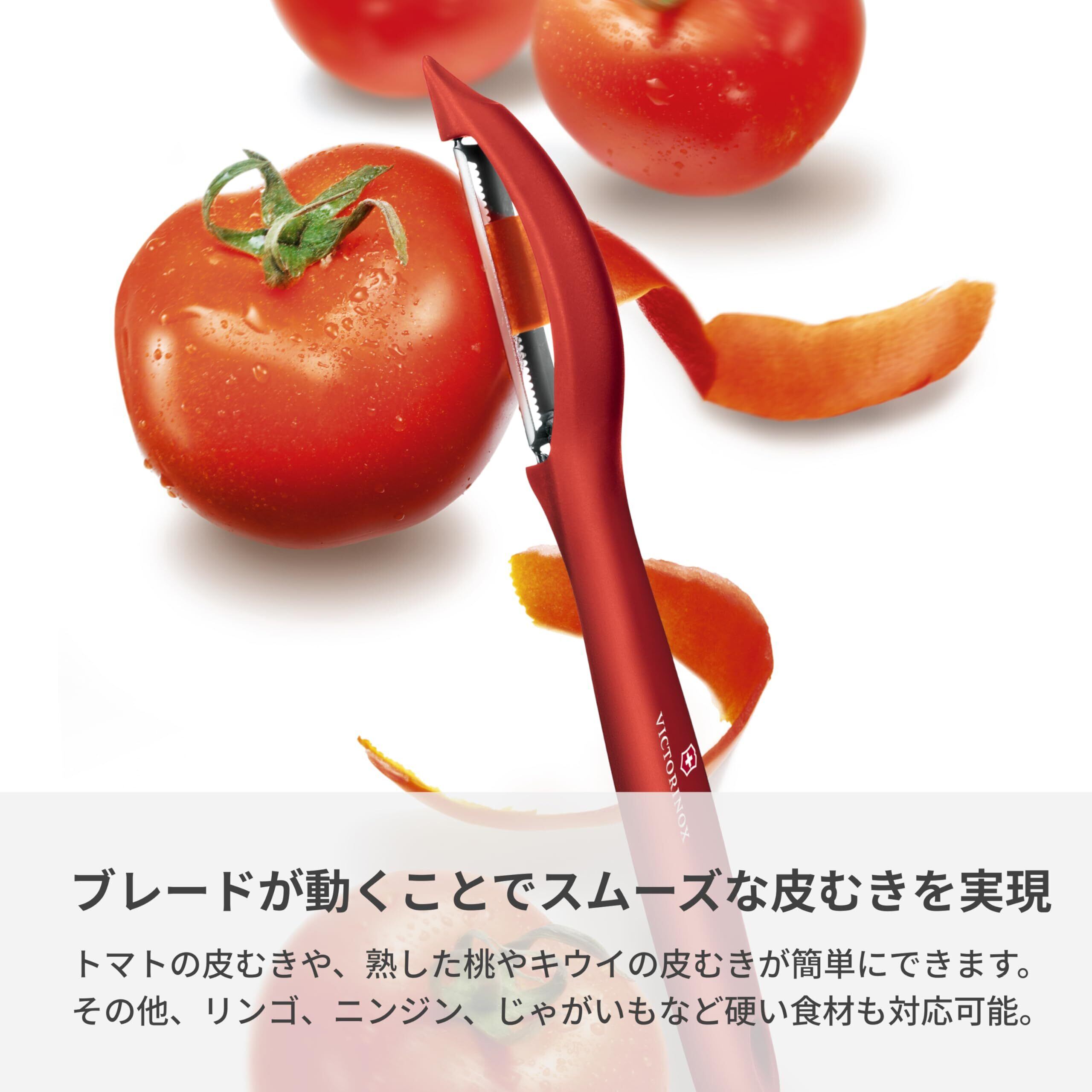 ギザギザの付いた刃が食材にしっかりと食い込むので、従来のピーラーでは不得意だったトマトの柔らかい皮を無理な力を入れず、スムーズにむくことが出来ます。トマトに限らず、野菜や果物の皮むき全般に使用できます。