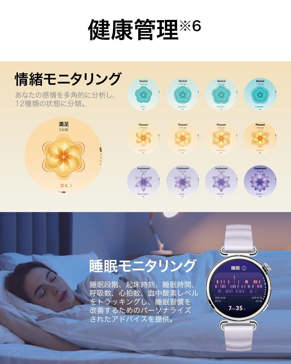 ■【健康モニタリング機能で安心の毎日!】情緒や健康状態をモニタリングする機能が搭載されており、心拍数、睡眠、ストレスレベルなどを細かくチェックできます。日々の健康管理をサポートし、あなたのライフスタイルをより良いものにします。