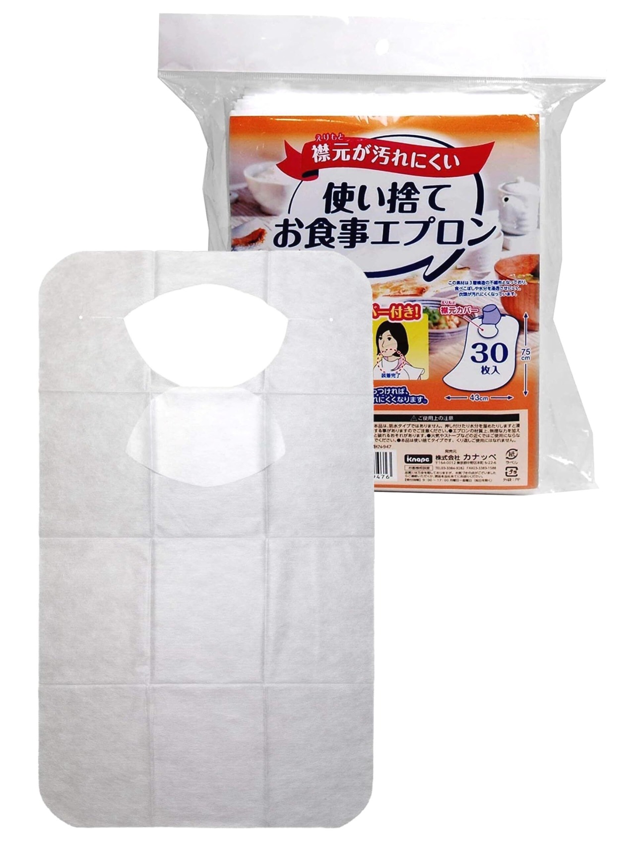 ストリックスデザイン お食事エプロン 使い捨て ホワイト 30枚 43×75cm 不織布 介護 大人 子供 外食 焼肉 男女兼用 襟元カバー付き 被るタイプ KN-947S