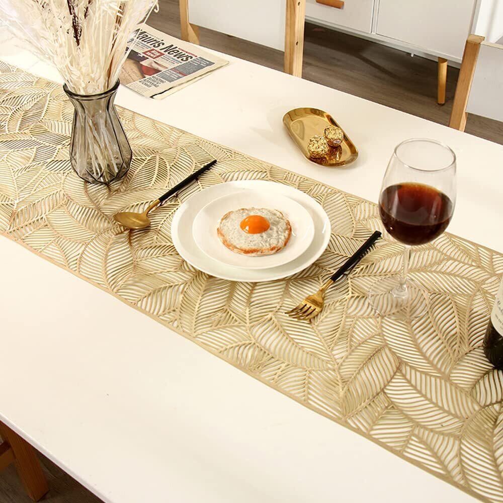 Socpuro テーブルランナー 金色 35*180cm テーブルカバー 華やか PVC 防水 防汚 食卓飾り 北欧 食卓 マット 断熱 滑り止め 透かし彫り ゴールド テーブル 飾り おしゃれ ビニール テーブルクロス 35*180cm クリスマス 結婚式 テーブル装飾 (葉の柄)