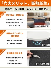 注意:この製品は、オーブン、電子レンジ、エアーフライヤーなどの調理器具で使用する際、機器から発する高温によるテーブルへの損傷を効果的に防ぐことができます。なお、IHクッキングヒーター用のシートとしての使用および直接的な火源との接触は固くお断りします。