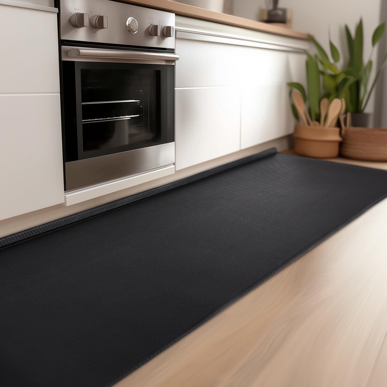【在庫処分】Gemarwel キッチンマット 拭ける【全ネット L字-折り目付き-床の隙間にピッタリフィット】 45x240cm 台所マット 6mm 分厚い 低反発 滑り止め 滑らない ふける 北欧 洗える 防炎 防寒 防音 撥水 PVC ポリ塩化ビニール おしゃれ かわいい 高級 ロング ブラック 無地 | SmartLiving+