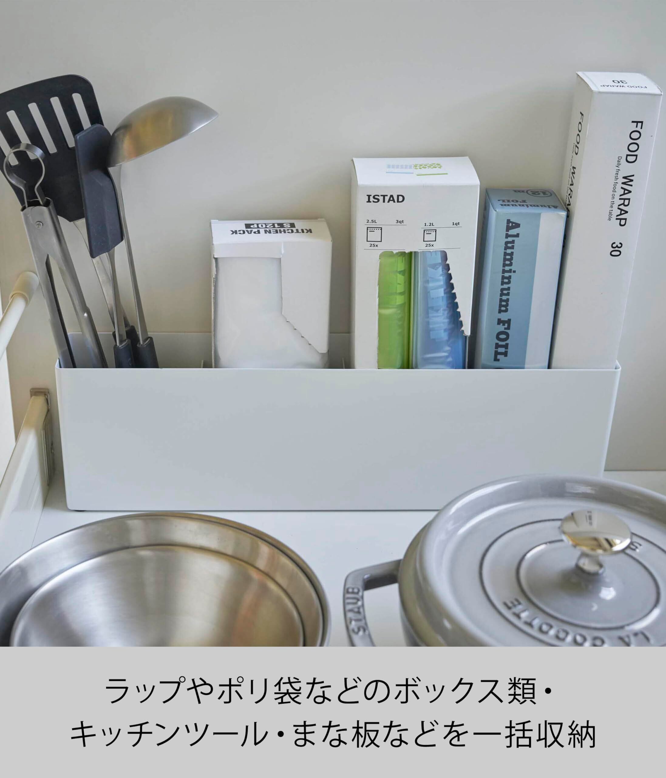 シンク下やコンロ下の収納の狭いスペースを有効活用!ラップやポリ袋などのボックス類、キッチンツール・まな板などを一括収納!置くだけの簡単設置。