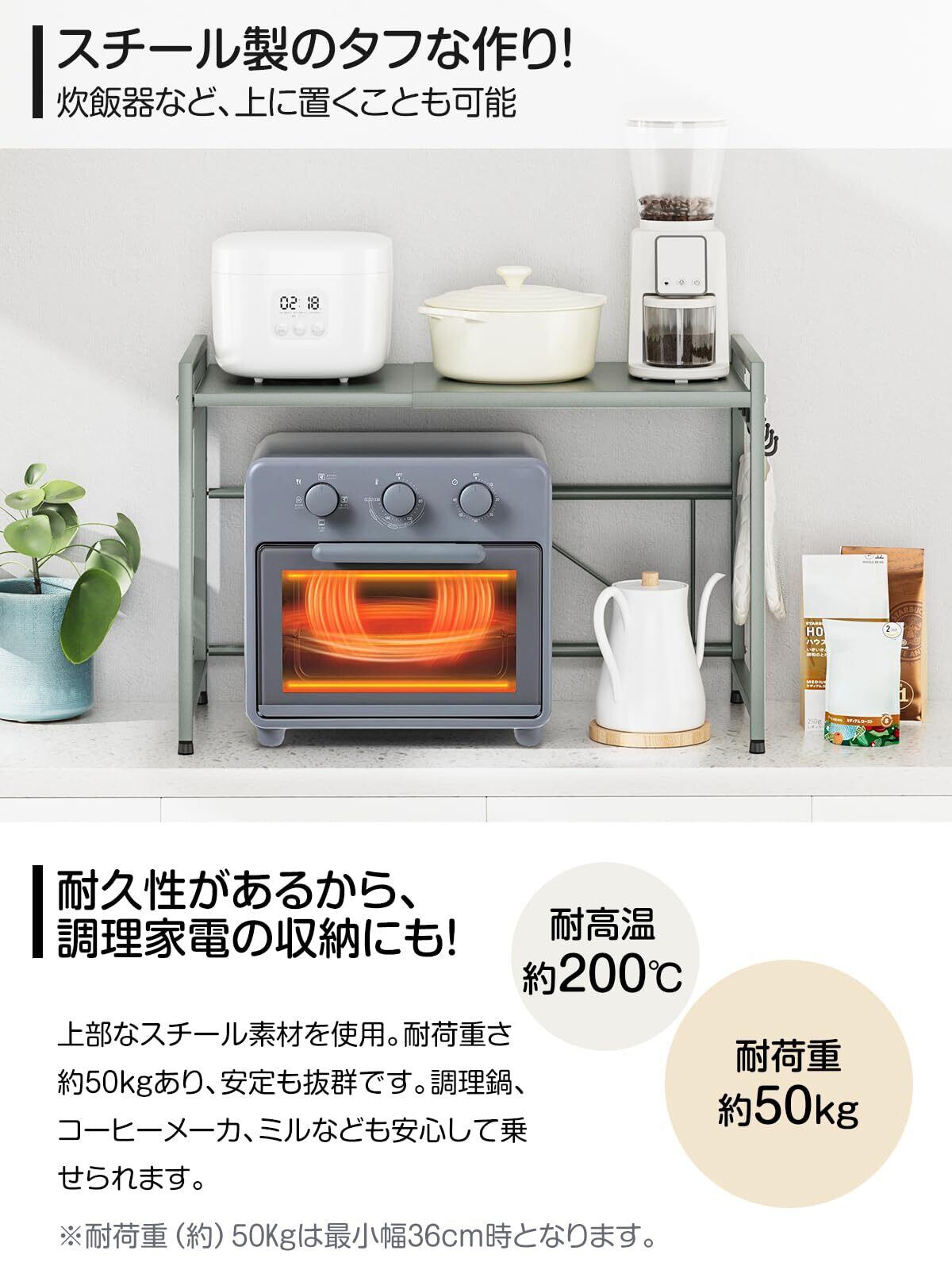 【在庫処分】DAIWIN レンジ上ラック トースターラック レンジラック 伸縮式 幅(36~59cm) 棚板高さ調節可 耐荷重50kg シンク上キッチン収納ラック フック4個付き (グリーン) | SmartLiving+