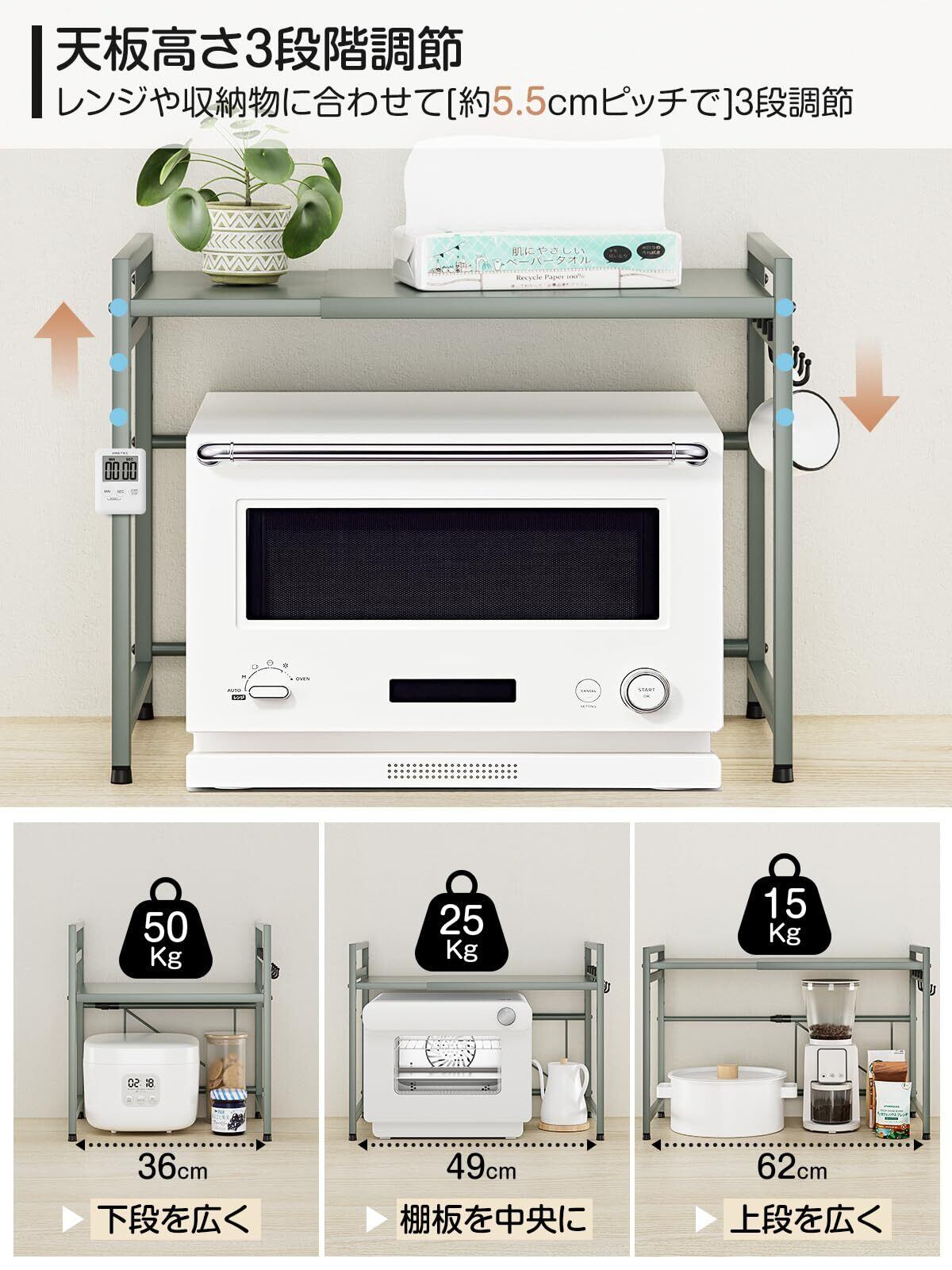 DAIWIN レンジ上ラック トースターラック レンジラック 伸縮式 幅(36~59cm) 棚板高さ調節可 耐荷重50kg シンク上キッチン収納ラック フック4個付き (グリーン)