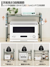 ■【多機能設計で収納力抜群!】耐荷重は50kgと高く、重いトースターや電子レンジも安心して置けます。高さ調節が可能な棚板により、収納する物に合わせて最適なスペースを確保でき、さらにフック4個付きでキッチン用具を吊るしておけるのも便利です。