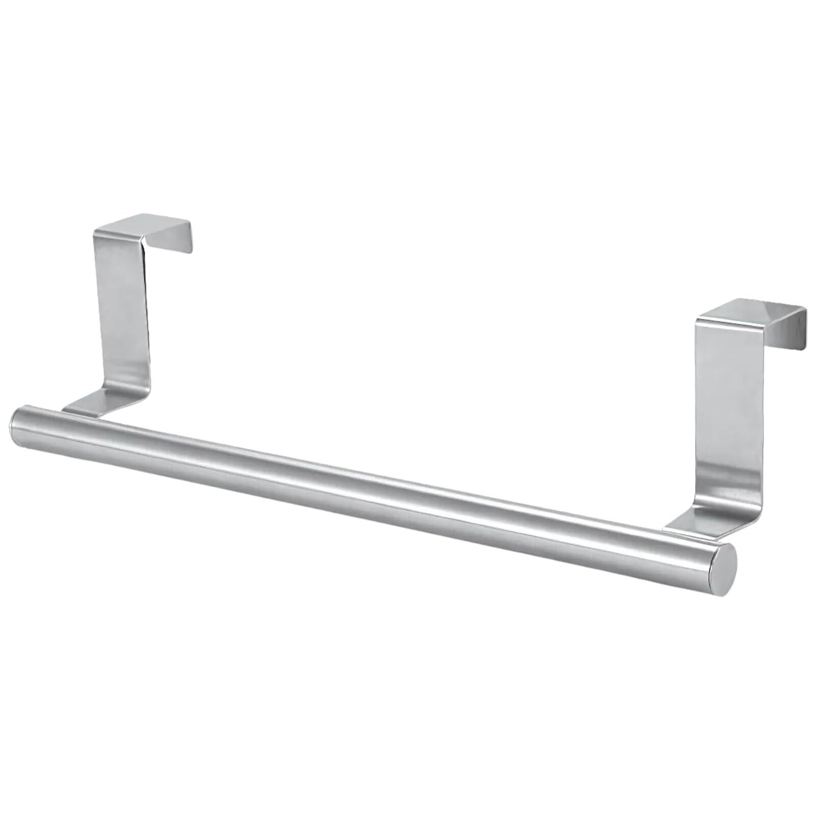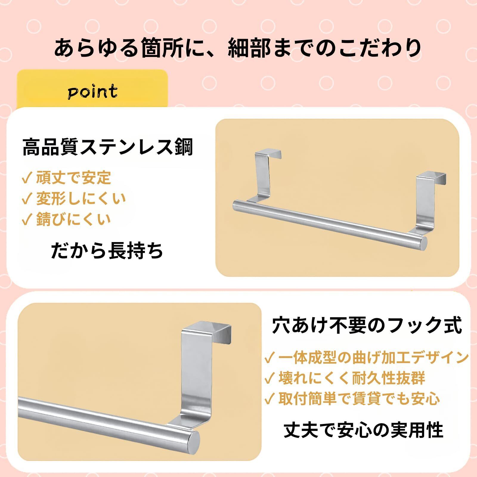 キッチンや洗面所に新たな収納スペースを作り出す、簡単取り付けのタオルバーです。穴あけ不要で、扉に引っ掛けるだけの手軽さが魅力。おしゃれなステンレスデザインは空間をすっきり見せ、インテリアにも調和します。