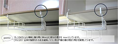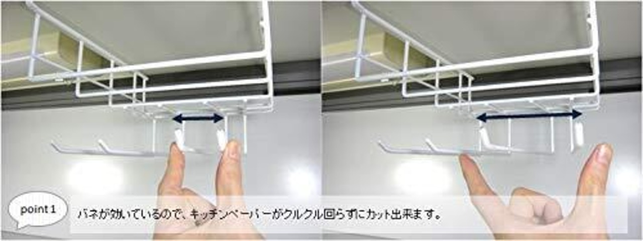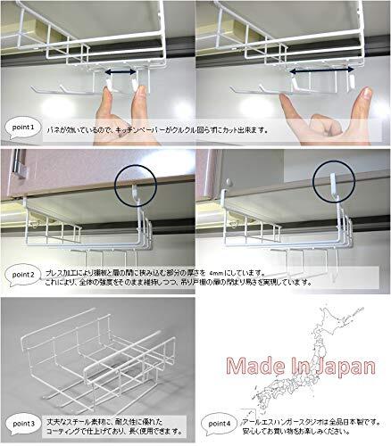 【日本製】ラップが4本収納できるラック。片手でカットできるキッチンペーパーハンガー付。ネジ止めなしで棚板に差し込むだけの吊り下げ収納・吊り戸棚下収納ラック。