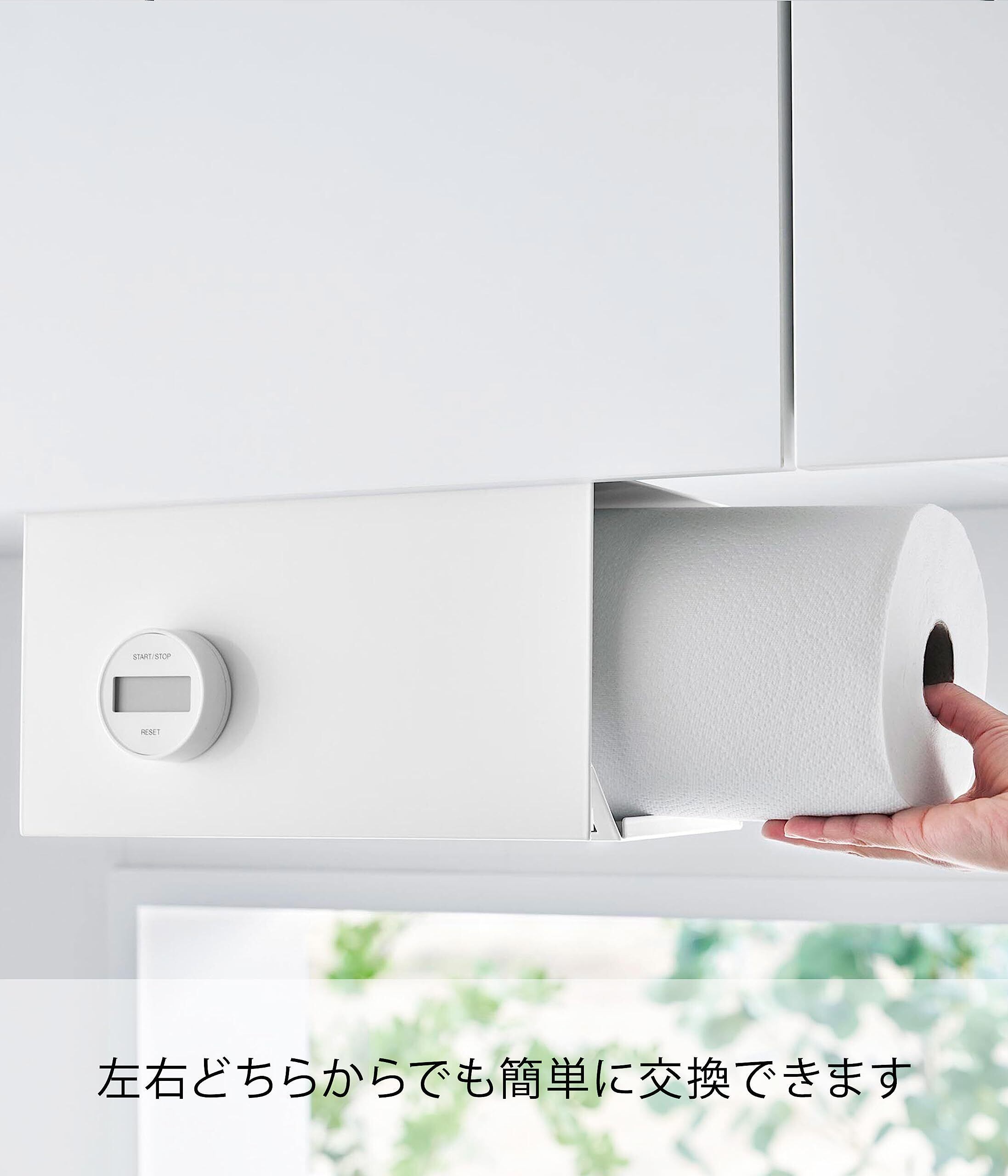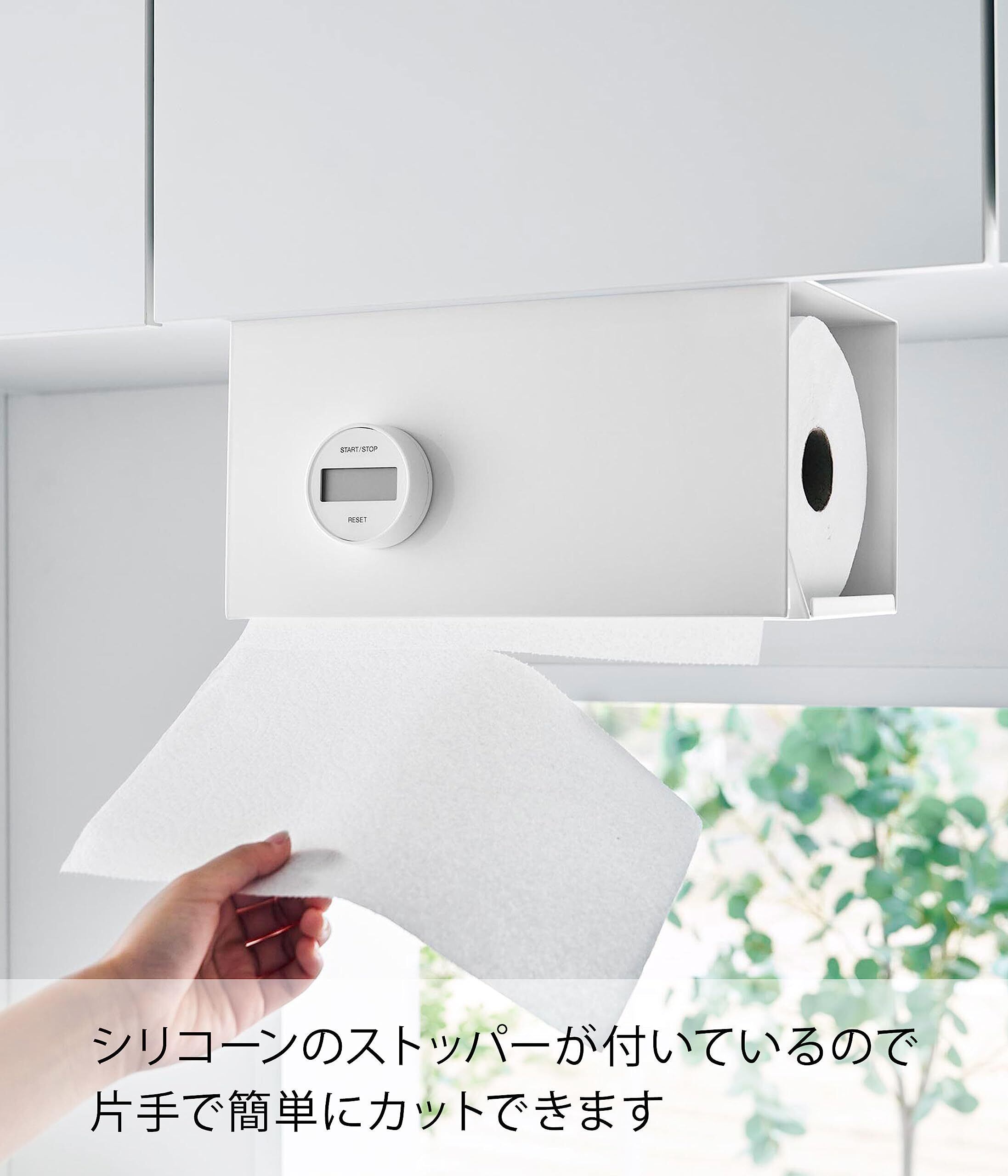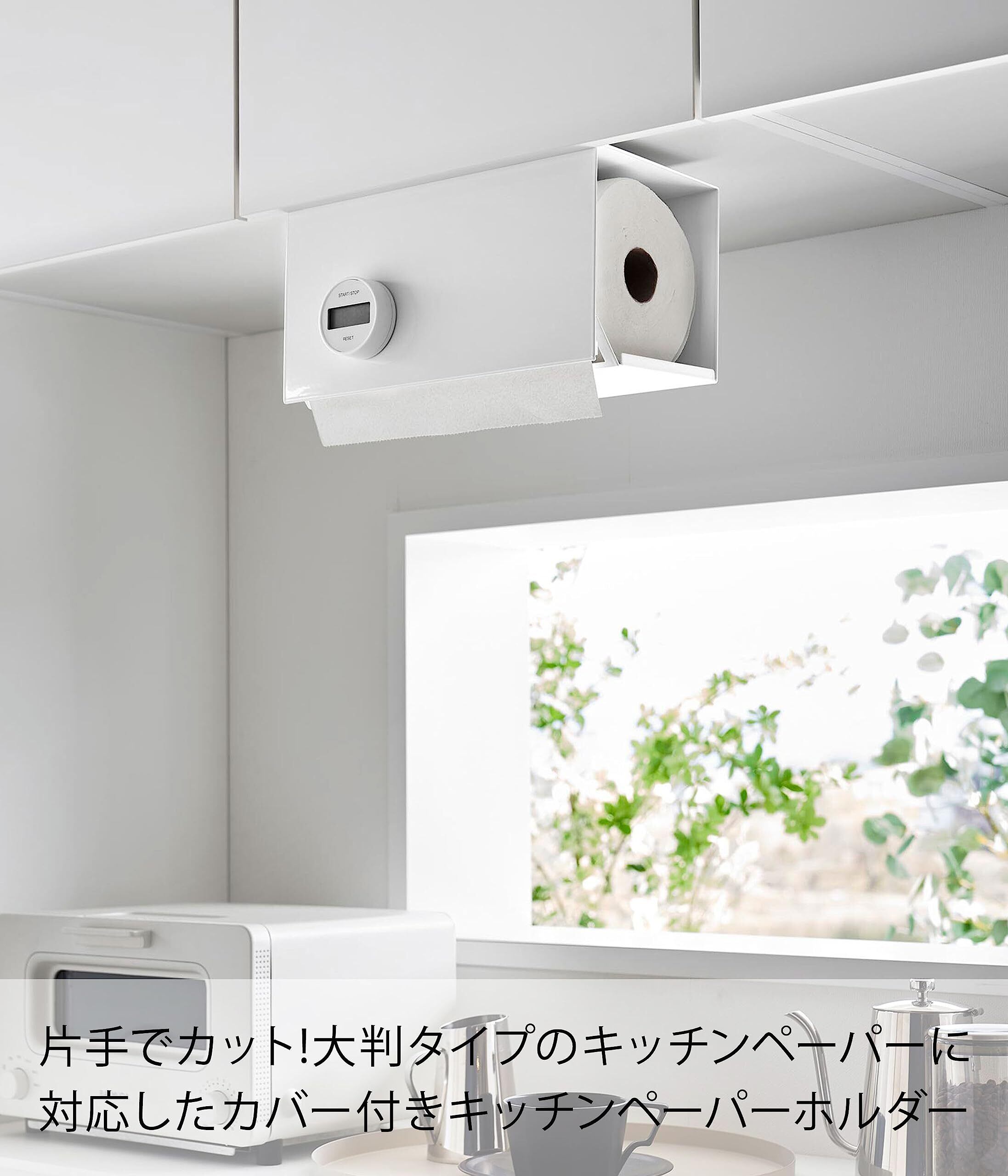 片手でカットできる!大判タイプのキッチンペーパーに対応したカバー付きの戸棚下キッチンペーパーホルダー。