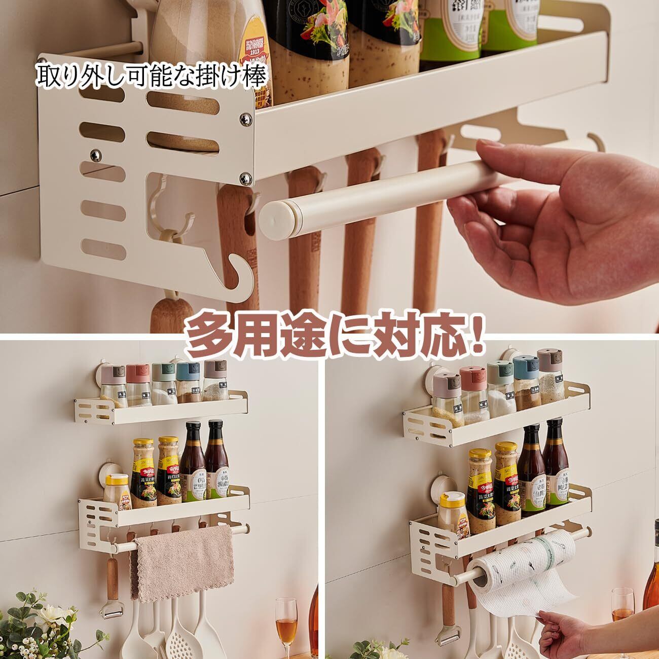 ■【多機能で便利な収納!】この調味料ラックは、調味料入れだけではなく、ふきん掛けやキッチンペーパーホルダーとしても活躍します。使い方に応じてさまざまなアイテムを収納できるため、日常の料理がさらに便利になります。