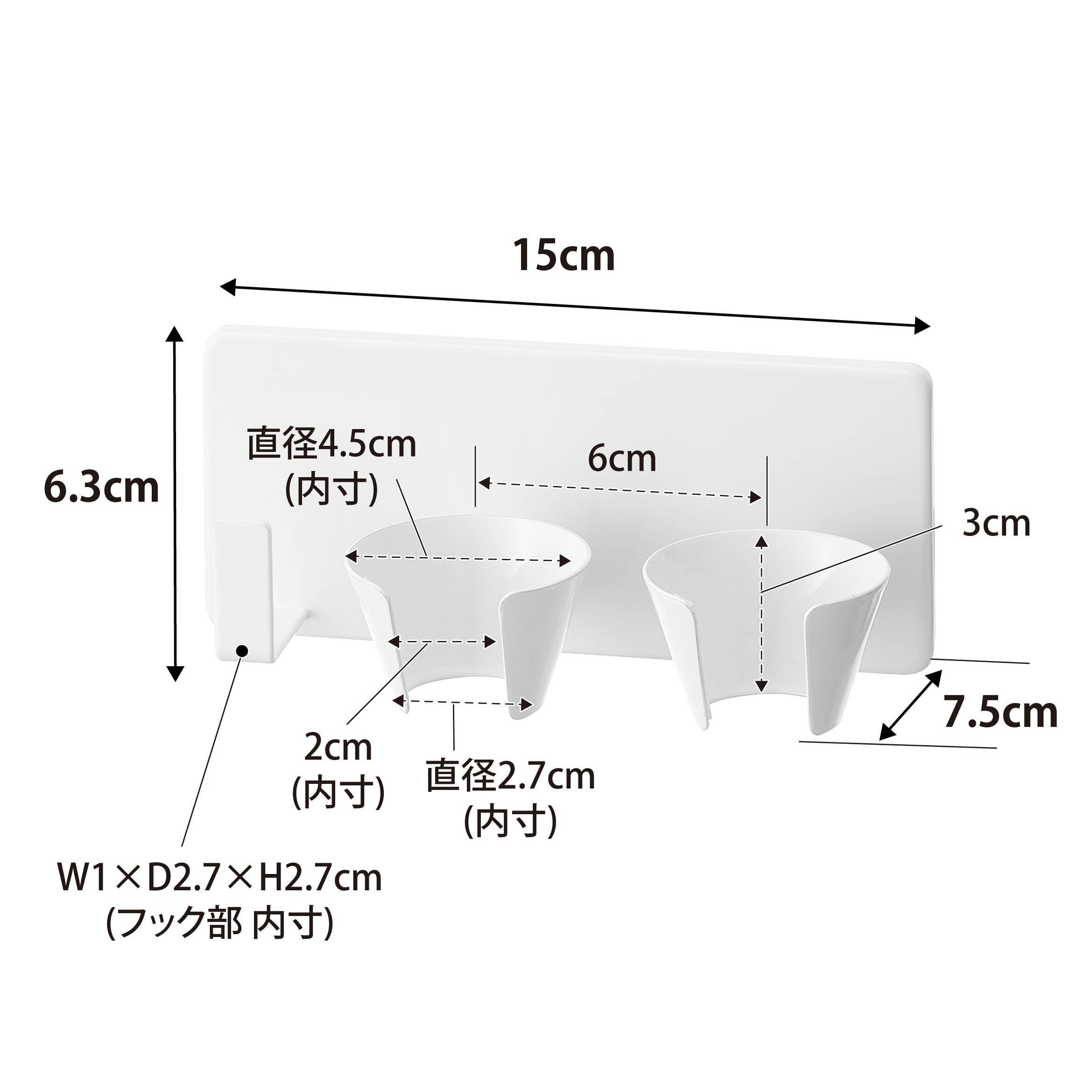 内寸 ホルダー部:上部直径4.5cm・下部直径2.7cm・高さ3cm(1つあたり) フック部:W1×D2.7×H2.7cm