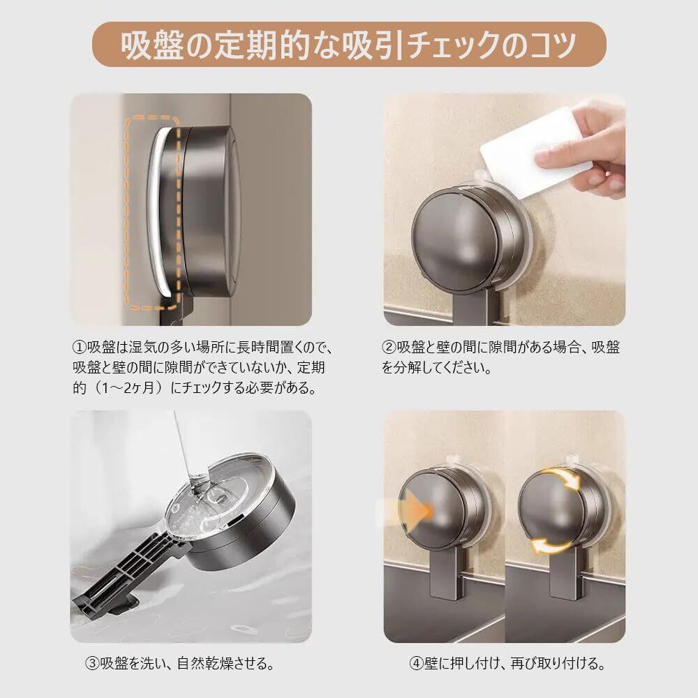 【工具不要で簡単取り付け】穴あけや工具なしで簡単に取り付け可能。タイルやガラス、大理石、木製などの平滑な面に強力に吸着し、賃貸住宅でも安心して使用できます。