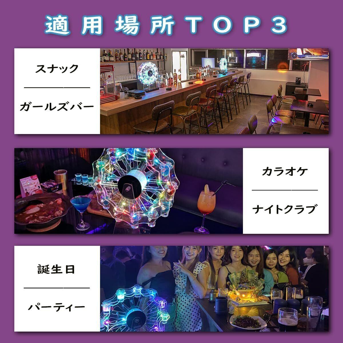 ■【充電式で便利!】全てのグラスが安定して配置でき、充電式バッテリーを搭載しているため、持ち運びも楽々。ナイトクラブやレストランなど、どこでもインスタ映えするスタイルで使用できます。賑やかなパーティーから落ち着いたディナーまで、シーンを選ばずにお楽しみいただけます!