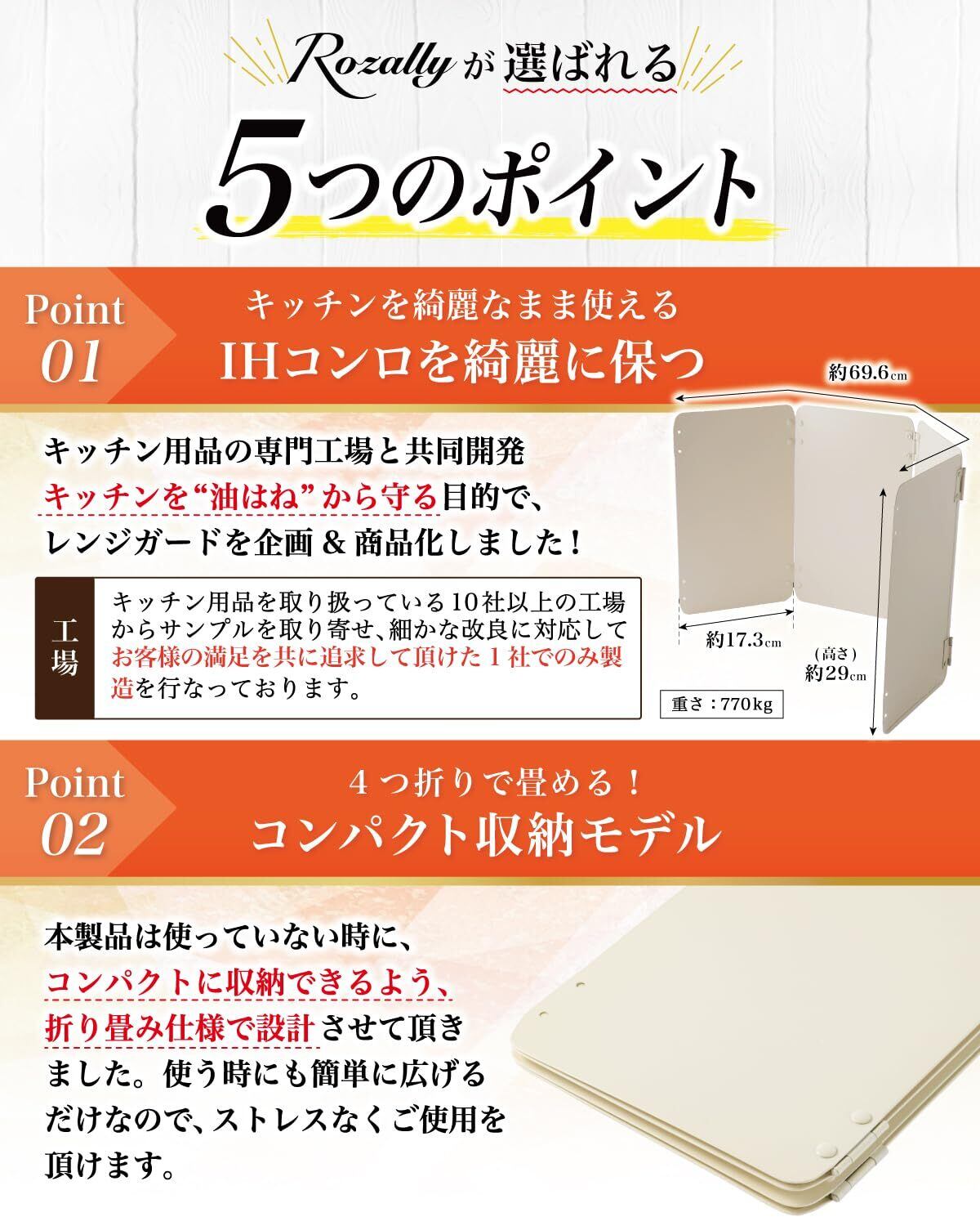 【こだわり】 様々なメーカーから キッチン 用品として ” 油はねガード ”や” 油よけガード ”など 日本製/中国製など様々に販売されていますが、 Rozallyの レンジガード は”こだわり”が一味違います。 「4面折りたたみ式のコンパクト設計」で場所を取らず、 「食洗機にも対応」で簡単にお手入れすることができます。 キッチン用に色味もこだわり おしゃれ なホワイト(アイボリー)を採用しました。