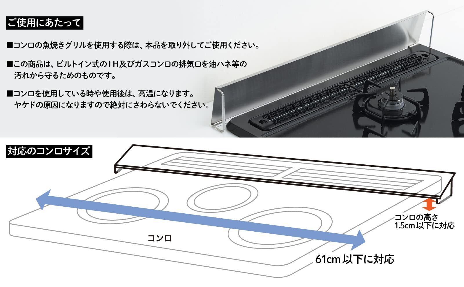 サイズ(約):幅62×奥行9.8×高さ4.2cm、適応サイズ:幅61cm以下、コンロの高さ1.5cm以下に対応