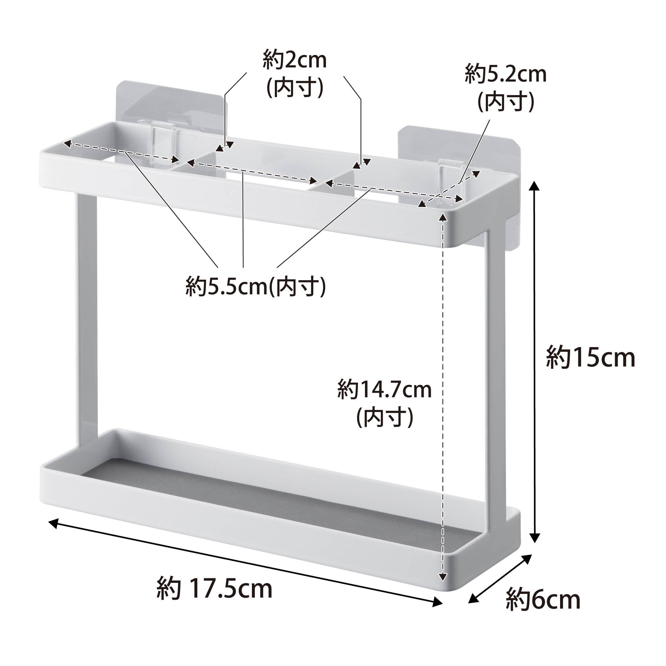 商品サイズ:本体:約W17.5×D6×H15cm(フィルムフック含まず) フィルムフック接着面:約W5×H5cm(1つあたり)  ・内寸:ホルダー1つあたり:約W5.5×D5.2×H14.7cm(隙間:D2cm)