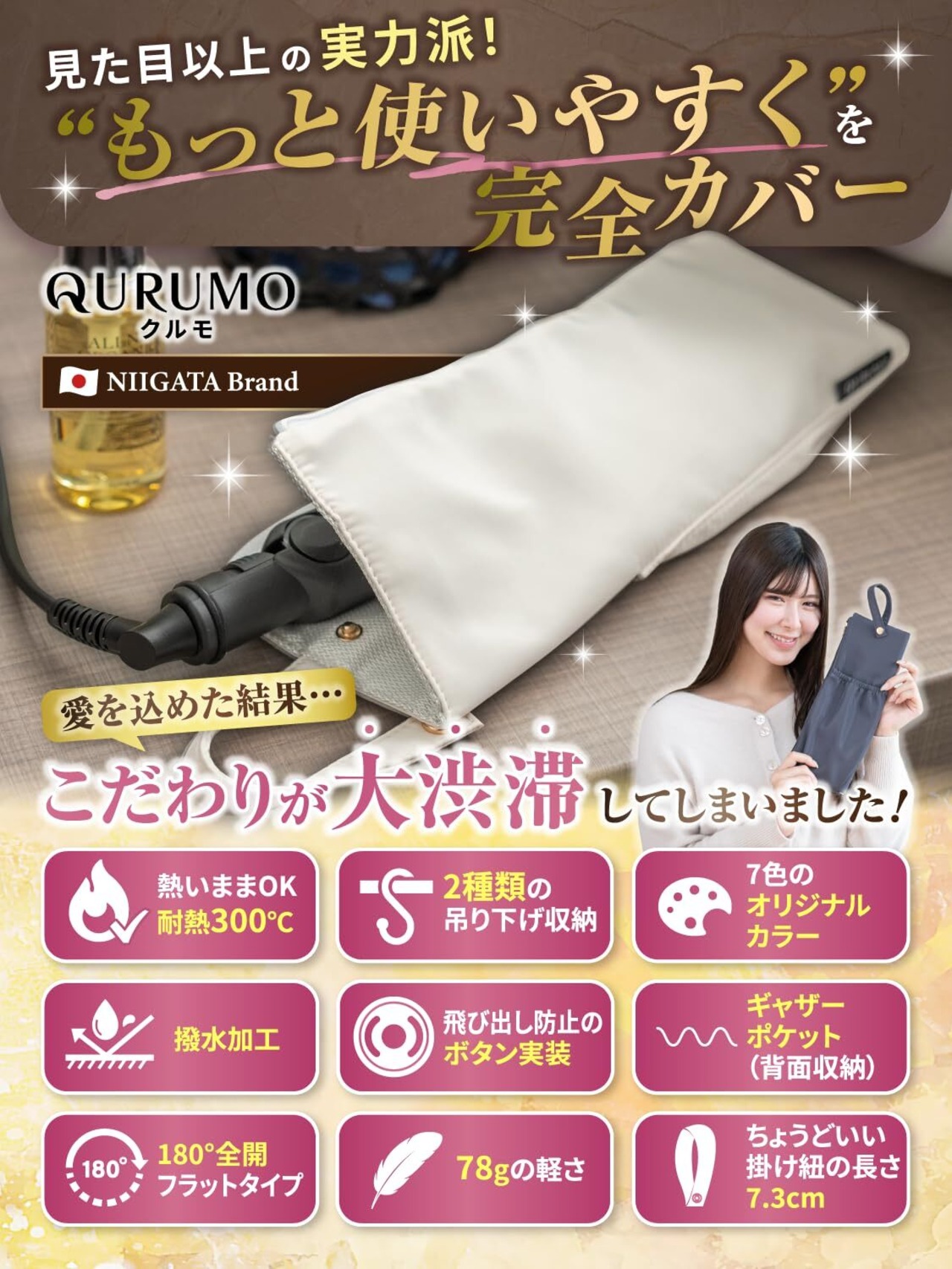 【"もっと使いやすく"を完全カバーしたヘアアイロンケースを新潟から】熱いままのヘアアイロンでも簡単に優しくくるっと包む、そのような思いを込めてQURUMO(クルモ)と名付けました。「見た目以上に使いやすい!」とは、\まさにQURUMOのための言葉なの?/と思えるほど、細部までこだわって企画、開発致しました!ぜひ、こだわりの大渋滞をご体感ください。