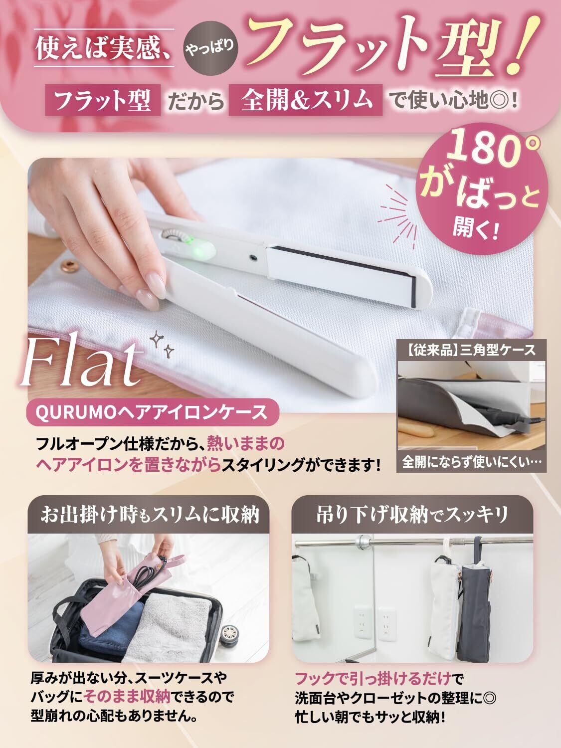 【"もっと使いやすく"を完全カバーしたヘアアイロンケース!】熱いままのヘアアイロンでも簡単に優しくくるっと包む、そのような思いを込めてQURUMO(クルモ)と名付けました。ヘアアイロンでのスタイリングの利便性を高めるために古オープンになるフラット型を採用し、さらに「見た目以上に使いやすい!」を突き詰めるために、こだわりにこだわって使い勝手を格上げいたしました。こだわりの大渋滞とも言えるほど細部までこだわって企画、開発致しました!ぜひ、ご体感ください