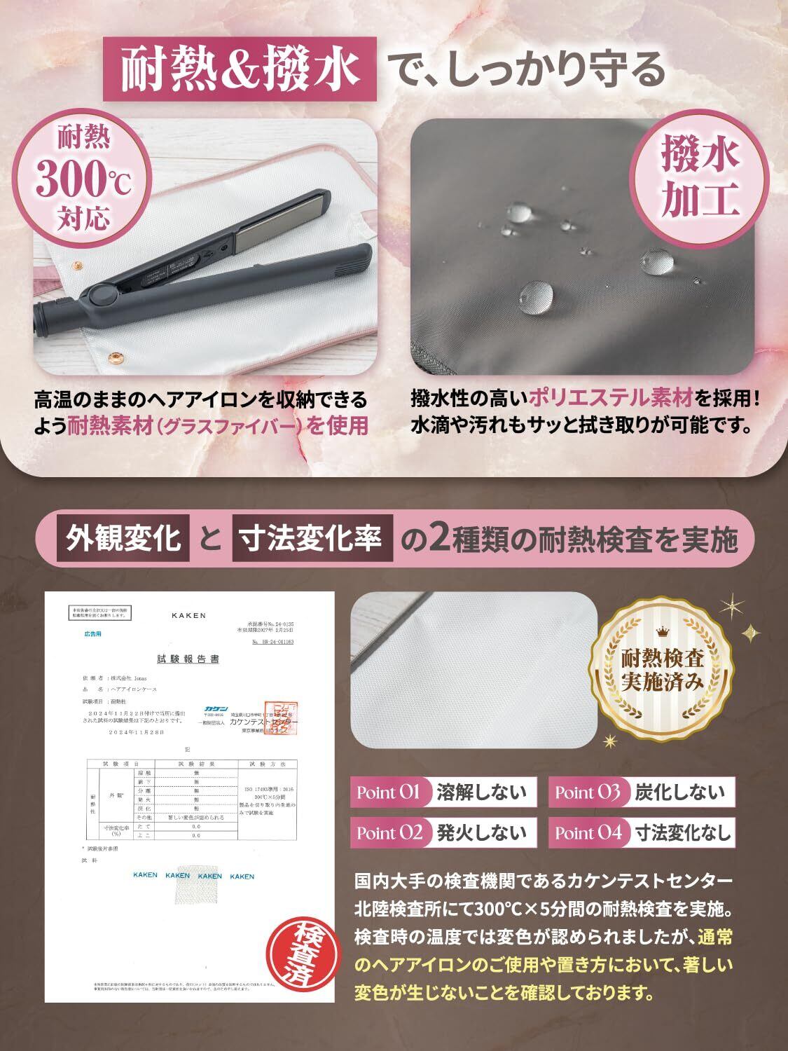 【耐熱&撥水でしっかり守る】裏地には耐熱素材としてぐらづファイバーを使用しております。大手検査機関カケンセンターにて「外観変化」と「寸法変化率」の2種の耐熱検査を300℃の環境下で実施しております。その結果、通常のヘアアイロンのご使用や置き方において影響がない耐熱素材であることが実証されております。また、撥水機能を高めるために表面素材にはポリエステルを採用致しました。水滴や汚れが付着した際は、柔らかい布でさっと拭き取っていただけます。