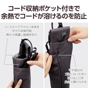 ■コードをヘアアイロン本体と分けて収納できる外ポケット付き。コードを熱から保護し破損を防ぎます。マチ部分がゴムになっているので、取り出し口を大きく開けられてかさばりやすいコードを入れやすい構造です。